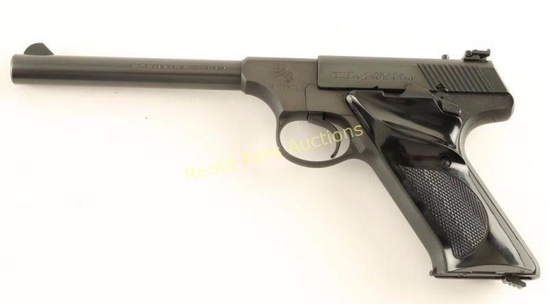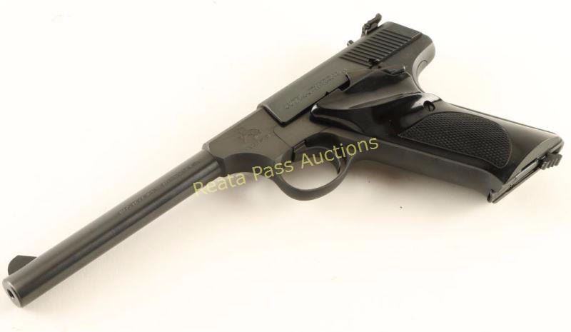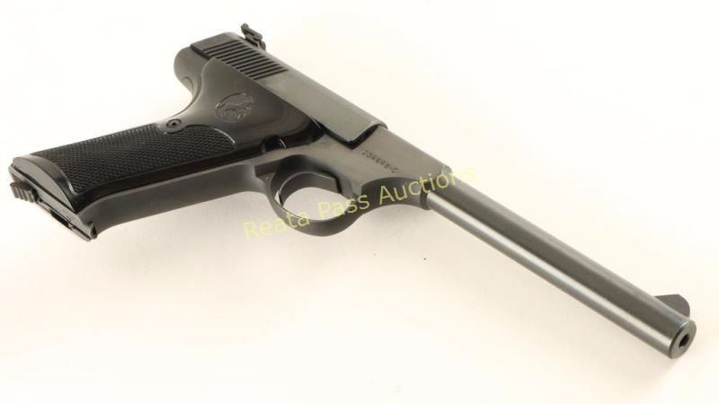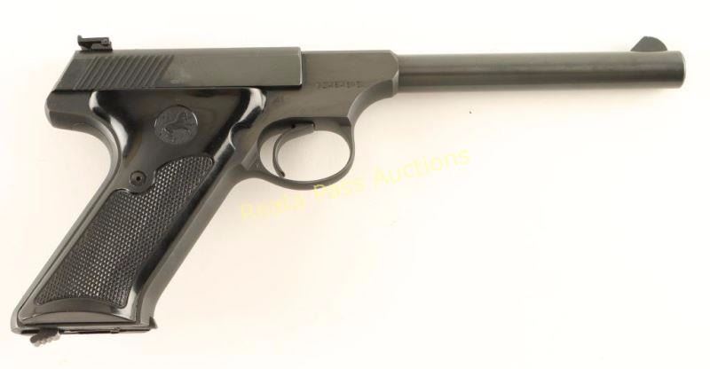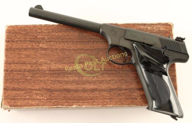 'Third Series' Minty single action semi-automatic target pistol chambered for .22 Long Rifle, circa 1959-1977. Approximately only 65,000 of these pistol were ever produced. Features a blued finish, 6" straight tapper barrel, blade front sight, adjustable rear target sight, smooth trigger, factory 10 round magazine, thumb safety/slide stop, and two-piece checkered black plastic thumb rest target grips. Includes a period Colt wood grain cardboard box with correct label, cleaning brush, documents and the serial number written on the underside of the box in sharpie. Pistol retains approximately 99% of it's original blued finish showing little to no visible wear. Action is smooth, bore is excellent and grips are fine. Condition is near new in box. ***Modern Firearm***