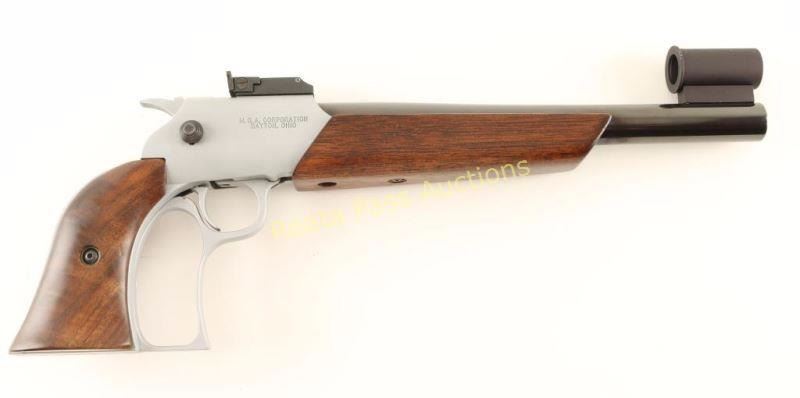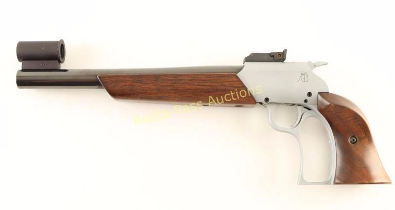 Custom falling-black single shot pistol chambered in 7mm Thompson Contender Ugalde. Features a blued/satin silver finish, heavy 10 11/16" tapered barrel, globe front sight, adjustable rear window sight, steel frame, closed loop lever, sliding safety, smooth trigger, serrated hammer spur, smooth wood forend and two-piece target grips. Pistol exhibits approximately 95% of it's blued finish showing light handling marks and a few minor losses. Action is smooth, bore is pristine and wood stocks are very good+ showing some light blemishes. Condition is very good+. ***Modern Firearm***
