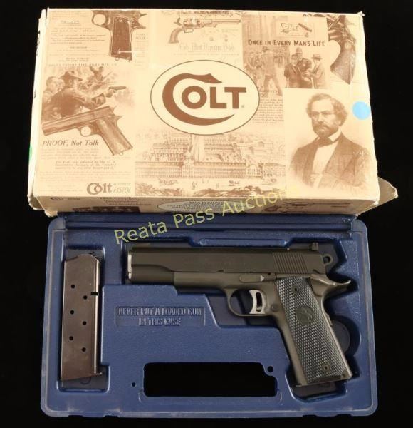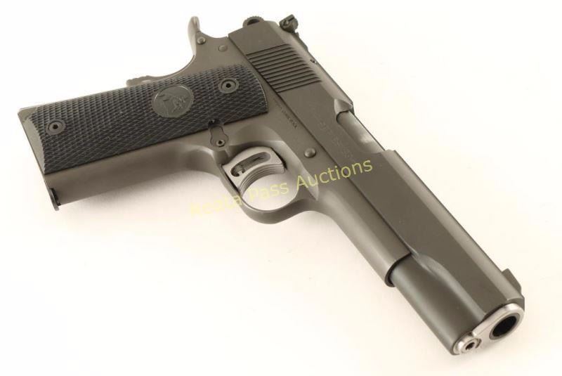 'Series 80' 1911-A1 style single action semi-automatic target pistol chambered in .45 Automatic. Features a matte black/grey dual tone finish, 5" barrel, Kings stainless steel barrel bushing, patridge front sight, adjustable rear window sight with white outline, adjustable wide serrated trigger, skeletonized trigger, beavertail grip safety, thumb safety, push button magazine release, Kings 8 round magazine, serrated mainspring housing, and two-piece checkered black rubber grips with Rampant Colt insignia. Includes the original factory sleeve and hard case with manual & factory 8 round magazine. Pistol exhibits approximately 96% of it's original finish showing slide wear on the barrel and light wear on the frame under the slide stop & manual safety. Action is sound, bore is excellent and rubber grips are fine. Condition is near excellent in box. ***Modern Firearm***