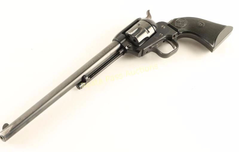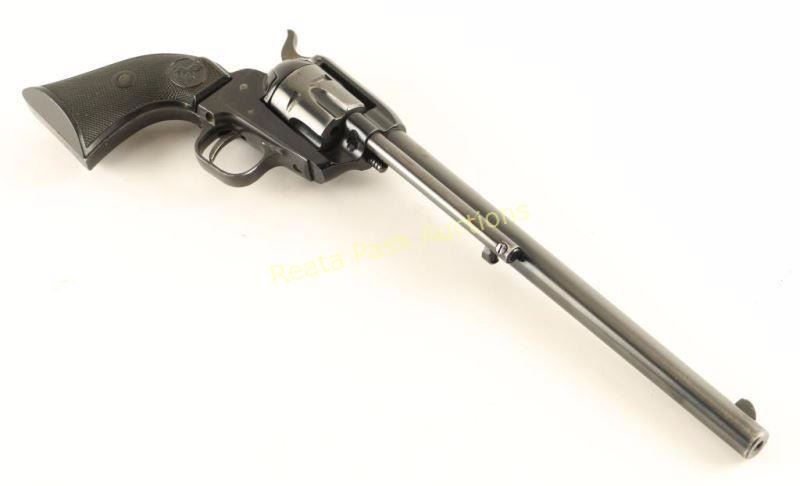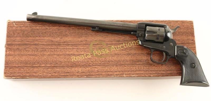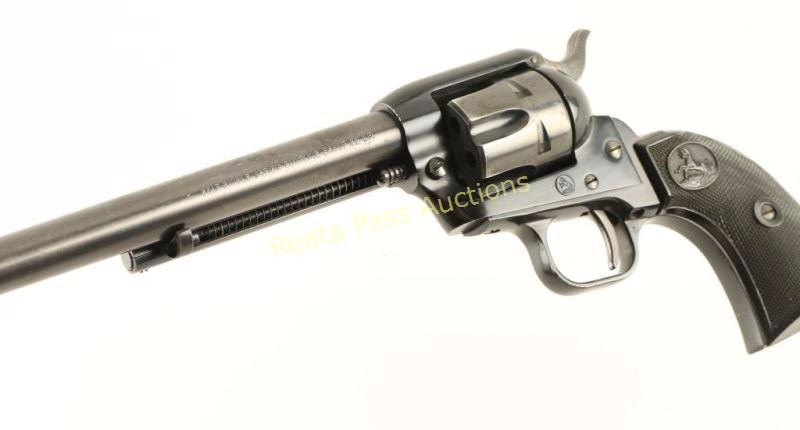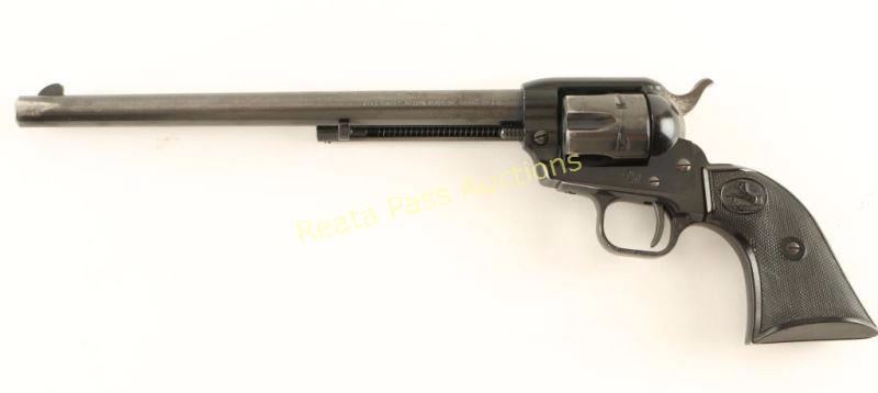 Small frame single-action long barreled revolver chambered in .22 Long Rifle, circa 1959. Features a blued/black finish, 9 1/2" barrel, ejector rod, blade front sight, square notched rear sight, alloy frame, fluted six-shot cylinder, checkered hammer spur and Rampant Colt two-piece checkered black composite grips. Includes a factory wood grain cardboard box with correct label, documents and the serial number written on the underside of the box in sharpie. Revolver retains approximately 75% of it’s original finish showing holster wear and scattered light oxidation on the barrel & cylinder. The front sight has a small notch cut into it and the hammer shows heavy oxidation on the exposed portion. Action is crisp with good lock-up, bore is excellent and composite grips are near fine. Condition is good to very good. ***C&R Firearm*** ***Modern Firearm***
