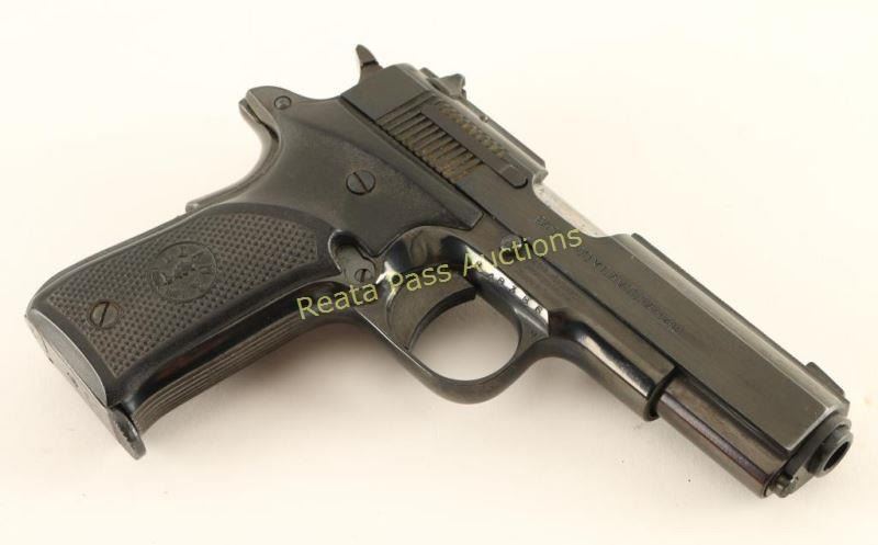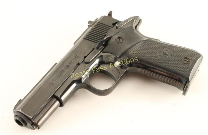 Spanish made semi-automatic pistol chambered in .32 Automatic and stylized like a miniature 1911. Imported by Stoeger Industries of S. Hackensack, N.J. with import marks on the frame. Features a blued finish, 3.75" barrel, ribbed slide, patridge front sight, adjustable rear window sight, serrated trigger & wide hammer spur, thumb safety, beavertail grip safety, push button magazine release, 7 round magazine, steel frame and two-piece checkered black plastic grips with Llama insignias. Includes the original factory hard case with a $163.99 receipt from Turners in Anahiem, CA, circa 1989. Pistol retains approximately 95% of it's original blued finish showing little wear and light scattered surface rust mostly on the left side. Action is crisp, bore is very good+ and grips are fine. Condition is very good+. ***Modern Firearm***