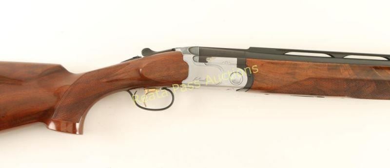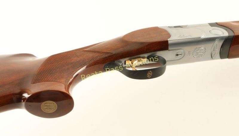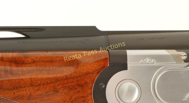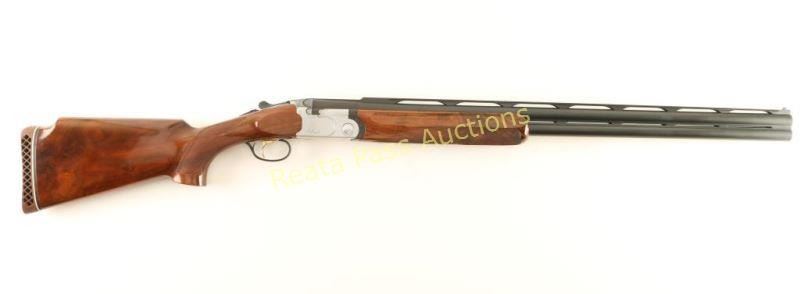 Italian made under/over double barrel trap shotgun chambered for 2 3/4" 12 gauge shells, circa 1991. Features matte blued 30" ventilation rib barrels with removable full/ improved modified chokes, automatic ejectors, white bead front sight, silver bead mid-sight, silver finished receiver, adjustable smooth gold trigger, pinned barrel selector/safety, high gloss checkered walnut semi-beavertail forend and pistol grip shoulder stock with high comb, pronounced palm swell & factory recoil pad. Shotgun exhibits approximately 98% of it's original finish showing only slight muzzle wear and a few very light handling marks. Action is crisp, bores are pristine and wood stocks are fine. Condition is excellent. ***Modern Firearm***