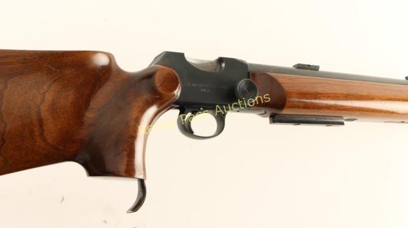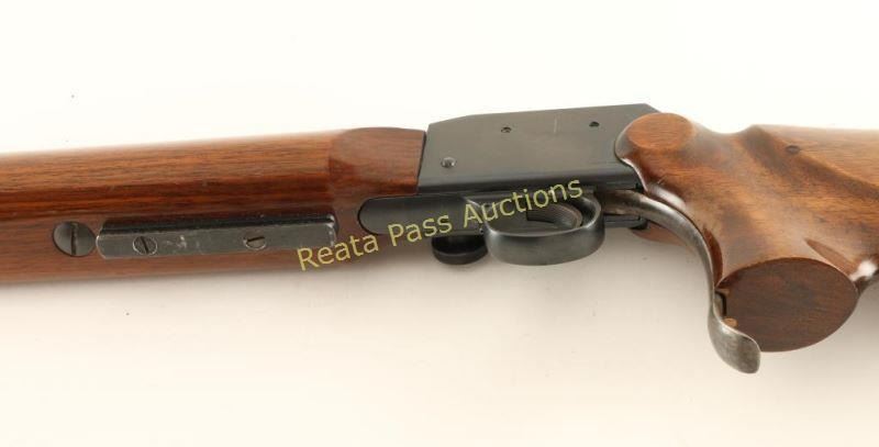 SN: UE7254X English made martini falling block single-shot target rifle chambered in .22 Long Rifle. Features a blued finish, heavy 29" barrel, no sights, installed scope blocks, wide serrated adjustable trigger, case hardened lever, smooth French walnut beavertail forend with accessory rails on it's underside and right handed pistol grip shoulder stock with cheek rest & factory buttplate. Rifle exhibits approximately 90% of it's blued finish showing smooth even wear on the barrel along the stock line and some light scattered handling marks. Action is crisp, bore is excellent and wood stock is very good with a couple small losses on the pistol grip and several small scattered blemishes. Condition is very good+++. ***Modern Firearm***