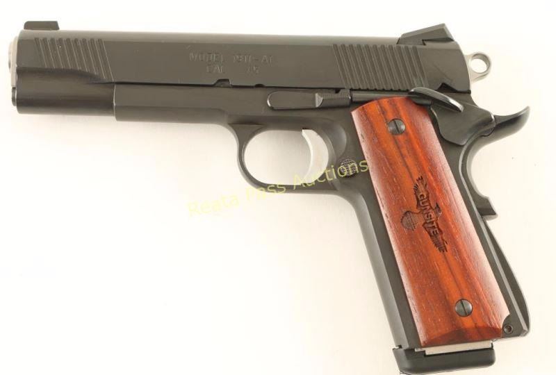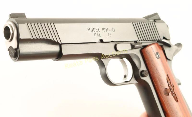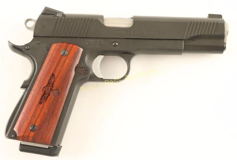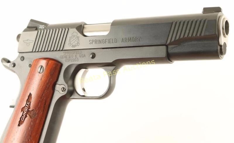 'Gunsite Service Pistol' Customized Springfield 1911-A1 single-action semi automatic pistol chambered in 45 Auto. Features a blued finish, 5" barrel, rounded edges, dual slide serrations, Trijicon front & rear sights with tritium insert, serrated round hammer spur, thumb safety, serrated adjustable trigger, large beavertail grip safety, serrated large mainspring housing, push button magazine release, 8 round Chip McCormick magazine, and two-piece smooth wood grips with laser cut Gunsite logos. Includes a Gunsite padded soft case. Pistol exhibits no visible wear. Action is crisp, bore is pristine and grips are fine. Condition is like new in case. ***Modern Firearm***