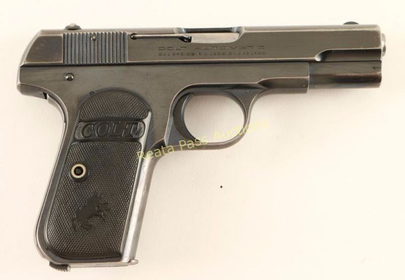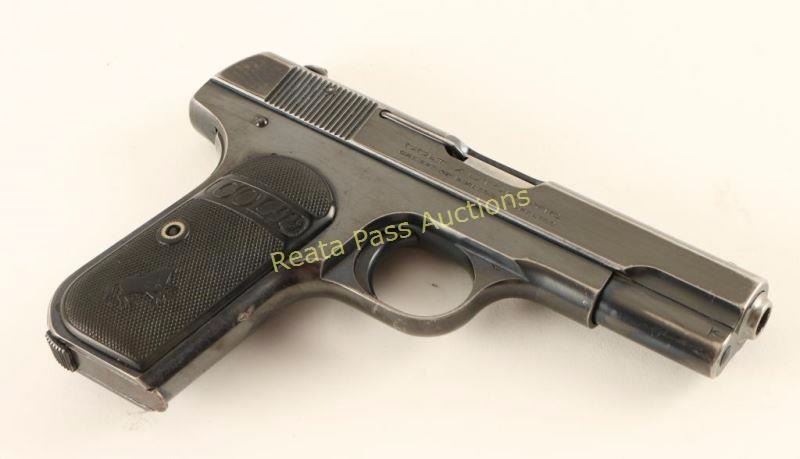 'Type III' Vintage concealed hammer semi-automatic pocket pistol chambered in .32 Auto, circa 1923. Features a blued finish, 3.75" barrel, fixed front sight, dovetailed rear window sight, manual safety, grip safety, 8 round magazine, and Colt two-piece checkered black hard rubber grips with Rampant Colt molded into them. Markings are crisp and all serial numbers match. Pistol exhibits approximately 84% of it's blued finish(which could be a factory or other very high quality refinish) showing moderate edge wear, handling marks and finish loss on the grip safety. Action is smooth, bore is very good and grips are good to very good as worn semi-smooth. Condition is very good+. ***C&R Firearm*** ***Modern Firearm***