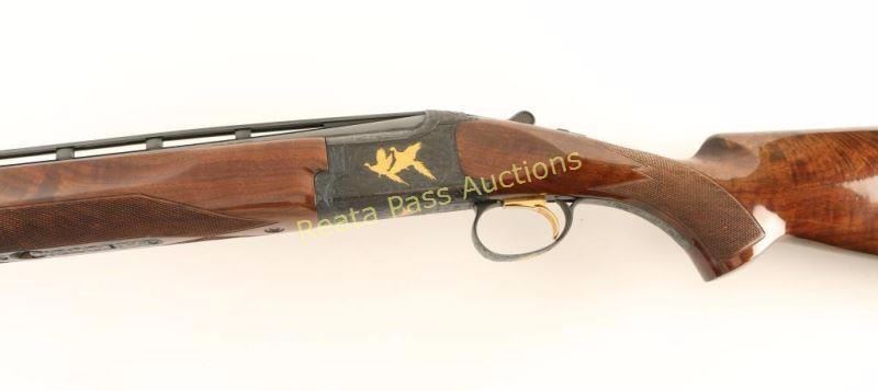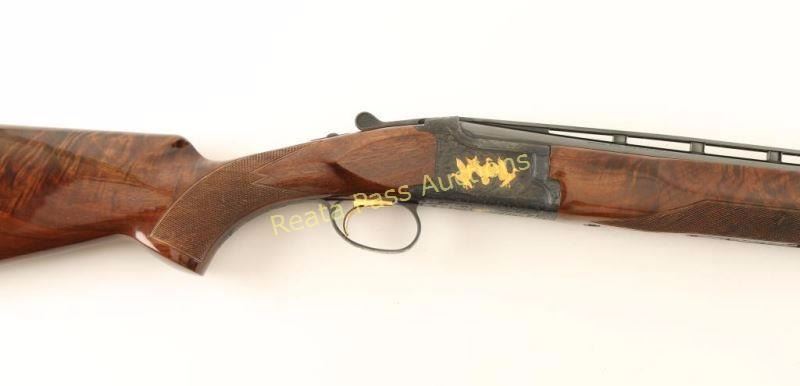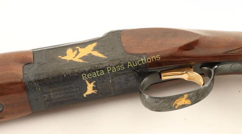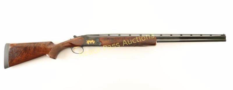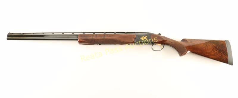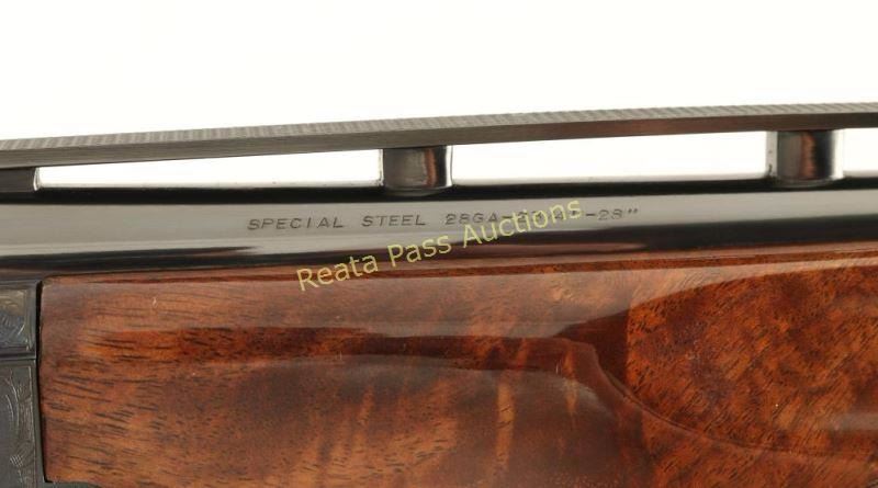 SN: 24962NY6E3 Highly embellished Japanese made under/over double barrel shotgun chambered for 2 3/4" 28 gauge shells, circa 1992. Features high polish blued finish, 28" barrels with a raised ventilation rib & skeet/skeet chokes, automatic ejectors, white bead sights, single wide checkered gold trigger, sliding tang safety/barrel selector, full coverage floral scroll engraved receiver with two gold pheasants on left side, three gold ducks on right, a gold bird dog on bottom & a gold flying quail on trigger guard, multi-point checkered grade VI walnut beavertail forend and pistol grip shoulder stock with Kick-Eez recoil pad. Shotgun exhibits little to no visible wear. Action is crisp, bores are pristine and wood stocks are near fine with a few small dings on the left side of the shoulder stock. Condition is excellent. ***Modern Firearm***