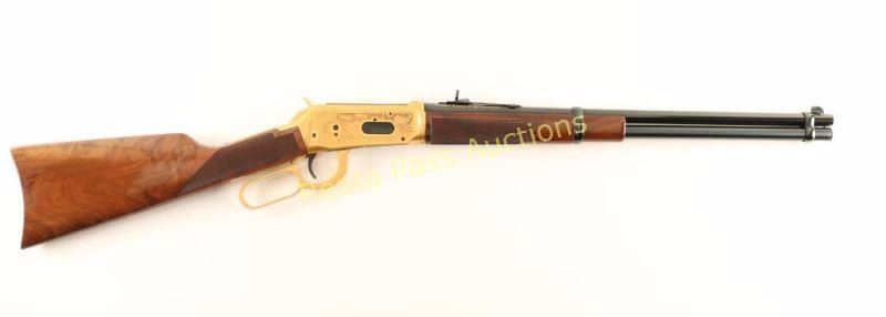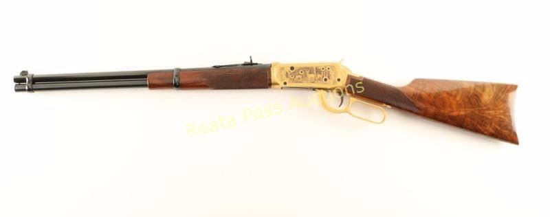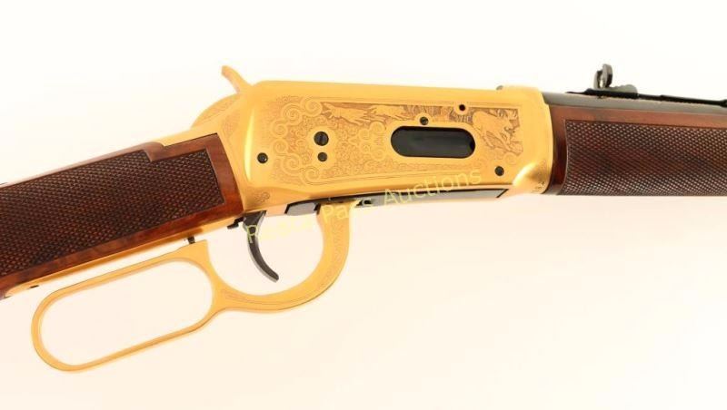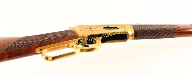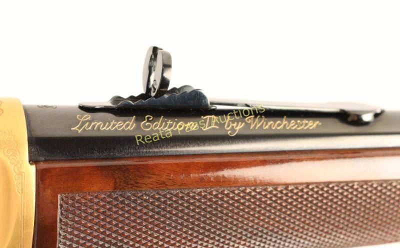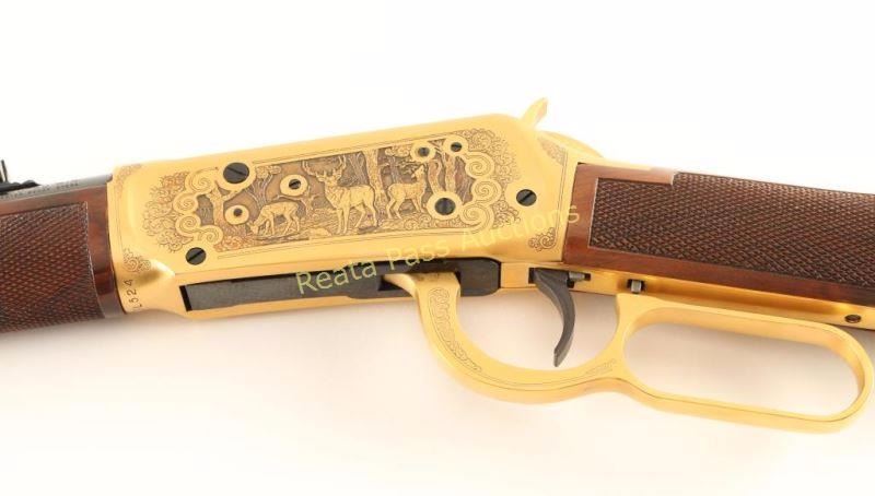 SN: 78L524 Ornate limited edition lever-action repeating rifle chambered in .30-30 Winchester, circa 1978-1979. One of only 1,500 produced. Features a 20" barrel with a high polish blued finish, dovetailed blade front sight, adjustable buckhorn rear sight, full length tube magazine, matte gold finished receiver with engraved game scenes & scroll borders, serrated hammer spur, beveled trigger, grip safety, checkered fancy walnut forend and straight grip shoulder stock with metal buttplate. Rifle exhibits approximately 98% of it's original finish showing a couple minor handling marks on the barrel and a small loss to the gold plating on the hammer. Action is crisp, bore is pristine and wood stocks are fine with light crazing. Condition is excellent. ***C&R Firearm*** ***Modern Firearm***