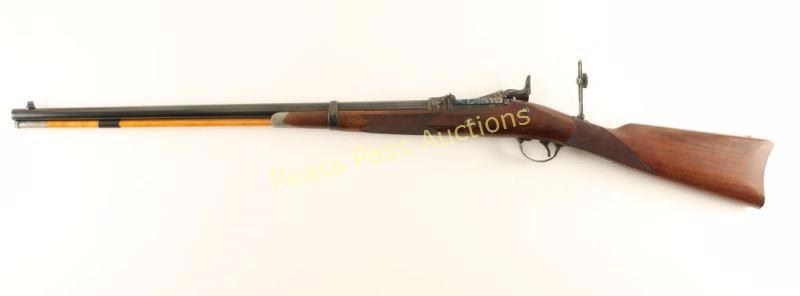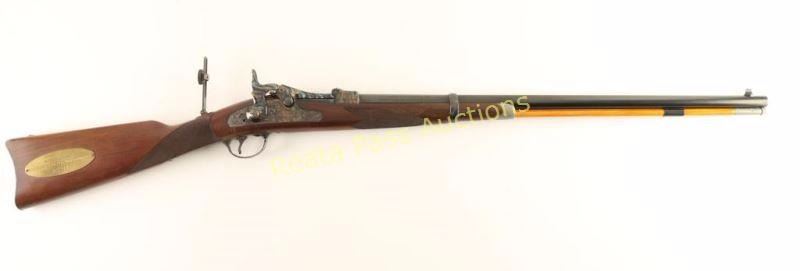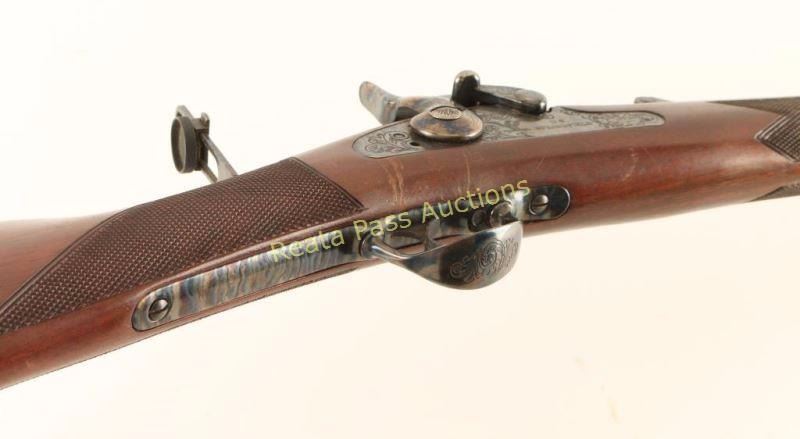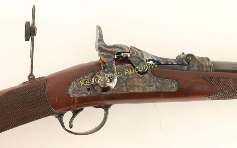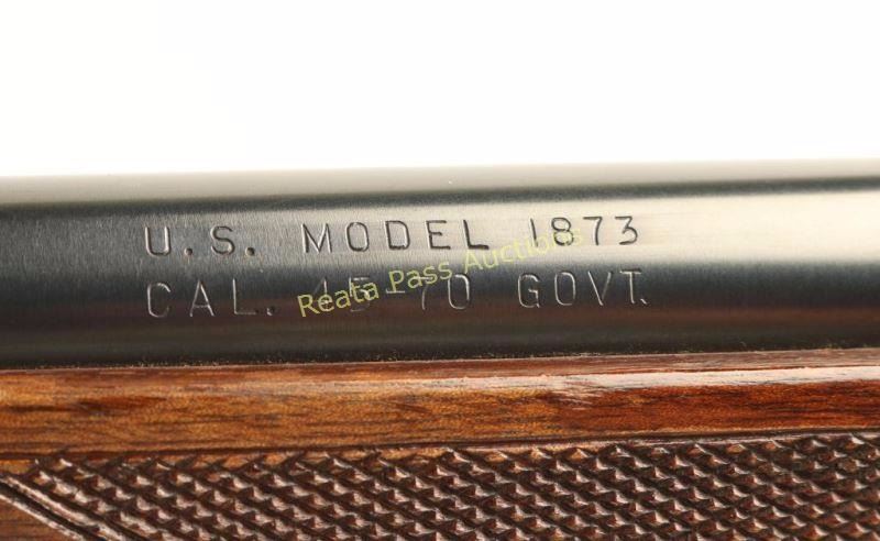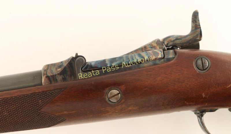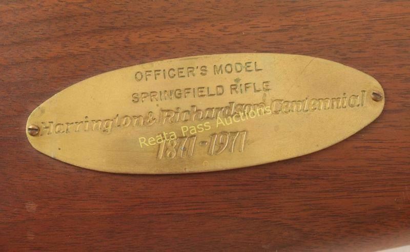 SN: 7404 Commemorative reproduction of the Springfield 1875 Officers Model trapdoor rifle chambered in .45-70 Government, circa 1971. Features a blued/case hardened finish, 26" barrel, dovetailed blade front sight with brass bead, adjustable rear aperture sight, wood cleaning rod, serrated trigger, scroll engraved action, checkered hammer spur, pewter forend cap and checkered walnut stock with metal buttplate & a brass oval plaque tacked on the right side of the buttstock that reads "OFFICER'S MODEL/SPRINGFIELD RIFLE/HARRINGTON & RICHARDSON CENTENNIAL/1871-1971". Rifle exhibits vivid case colors and approximately 98% of the blued finish on the barrel showing a few light handling marks & a small spot of emerging surface rust near the muzzle. Action is sound, bore is excellent and wood stock is very good+ showing light wear & scrapes. Condition is very good+++. ***C&R Firearm*** ***Modern Firearm***