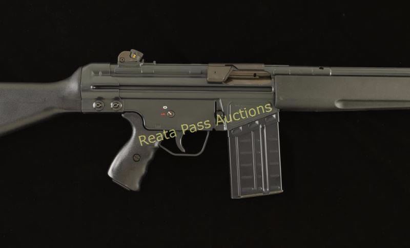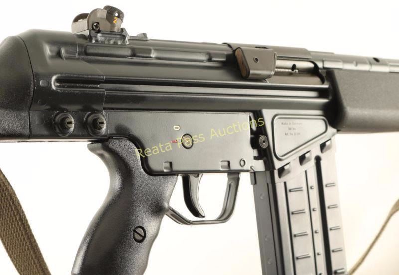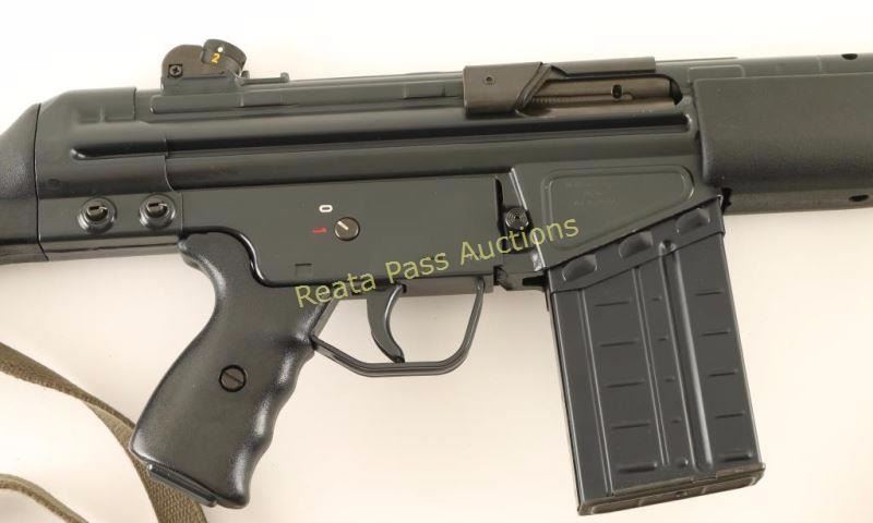 Desirable German made recoil-operated semi-automatic battle rifle chambered in .308 Winchester. Features a matte black finish, 17.7" barrel, flash hider, folding charging handle, hooded post front sight, variable rotating rear aperture sights, manual safety, green canvas sling, push button magazine release, shell deflector, factory 20 round G3 magazine, black synthetic forearm, finger groove pistol grip and should stock. Rifle retains approximately 98% of it's original finish showing light wear along the charging track and a few other small scattered losses. Action is strong, bore is pristine, and synthetic stocks are fine. Condition is near new. ***Modern Firearm***