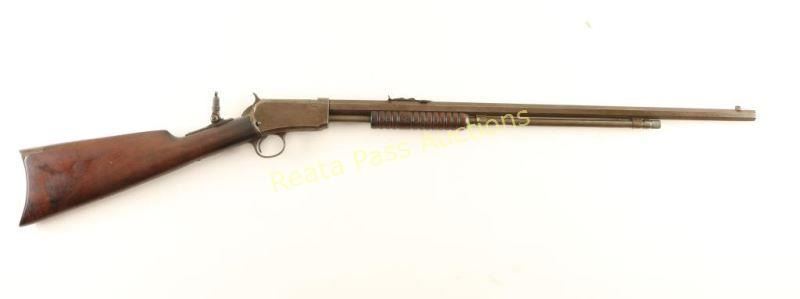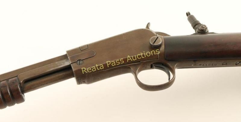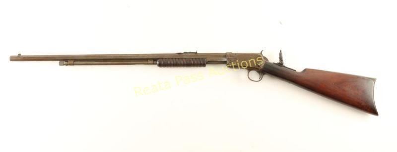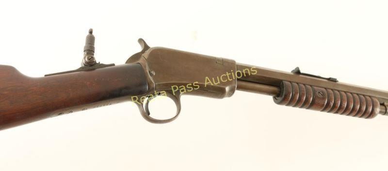 Vintage slide action take-down repeating rifle chambered in .22 Long Rifle, circa 1927. Features a blued finish, 24" barrel, dovetailed blade front sight, adjustable rear sporting sight, Marble tang sight, 3/4 length tube magazine, take-down receiver, smooth trigger, checkered hammer spur, grooved walnut slide handle and smooth straight grip shoulder stock with crescent metal buttplate. Rifle exhibits less than 10% original finish with the balance turned to a nicely aged light brown/grey patina. Action performs well, bore is very good+ and wood stocks are very good with two hairline cracks extending from the upper tang & one hairline crack extending from the lower tang. Condition is very good. ***C&R Firearm*** ***Modern Firearm***