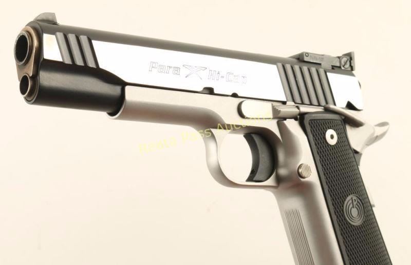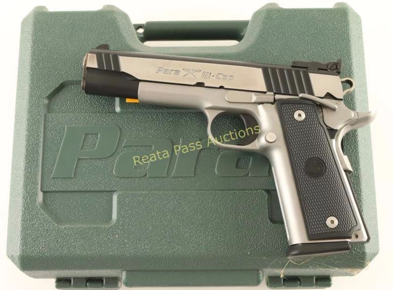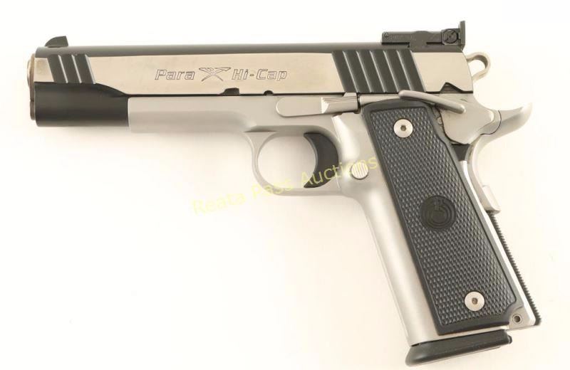 'Hi-Cap Limited' Canadian made double stack 1911-A1 style semi automatic pistol chambered in .45 Auto. Features a black coated slide with brushed stainless flats & dual serrations, 5" barrel, dovetailed patridge front sight, adjustable rear window sight, serrated adjustable trigger, skeletonized hammer, ambidextrous thumb safety, large beavertail grip safety, checkered mainspring housing, push button magazine release, 14 round factory magazine, satin finished frame and Para Ordnance two-piece checkered black plastic grips. Includes the original green plastic hard case with documents and lock. Pistol exhibits minimal handling marks and light wear to the black coated finish on the slide near the ejection port. Action is strong, bore is excellent and grips are fine. Condition is excellent. ***Modern Firearm***