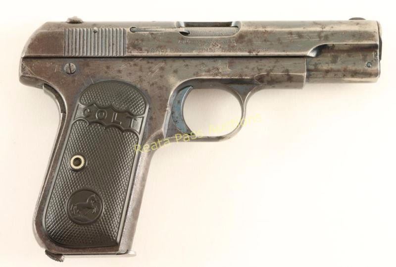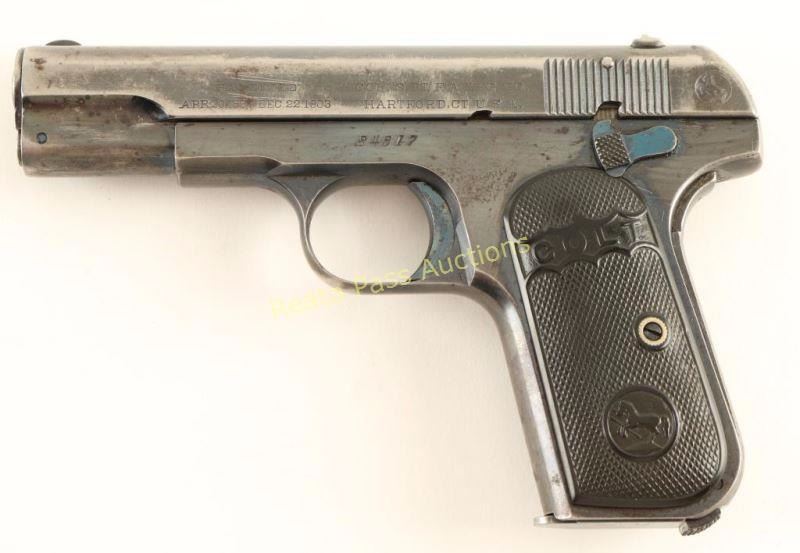 'Type II' Early concealed hammer semi-automatic pocket pistol chambered in .32 Auto, circa 1909. Features a blued finish, 3.75" barrel with removable bushing, fixed front sight, dovetailed rear window sight, manual safety, grip safety, factory two-tone 8 round magazine, and Colt two-piece checkered black hard rubber grips with a Rampant Colt inside a circle molded into them. The name "George Martindale" is inscribed on the inside of the right grip panel and the initials "GFM" have been stamped in two places on the right side of the frame. Pistol retains approximately 42% of it's original blued finish showing heavy wear and scattered light surface rust emerging predominately on the right side from storage. Action is smooth, bore is good with scattered pin-prick pitting and hard rubber grips are good+ with semi-worn checkering. Condition is good. ***C&R Firearm*** ***Modern Firearm***