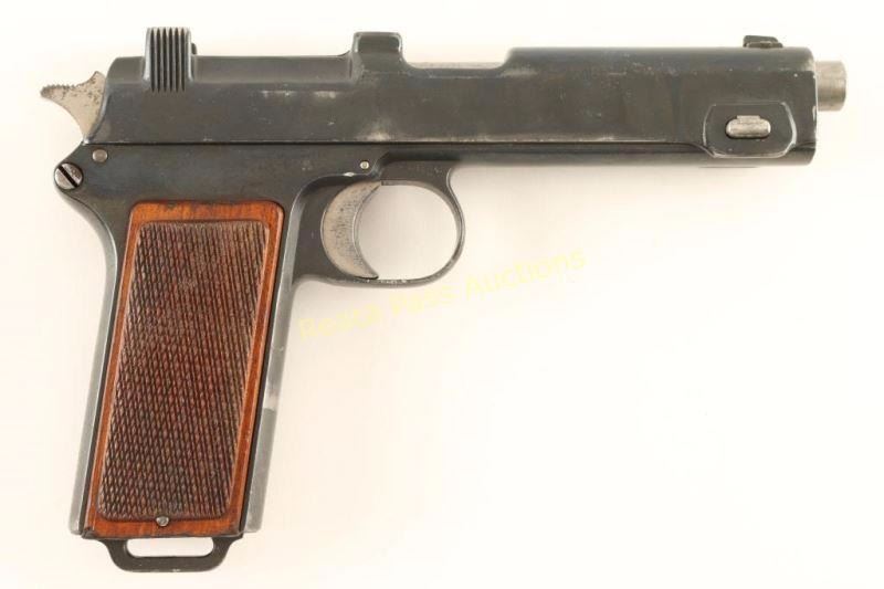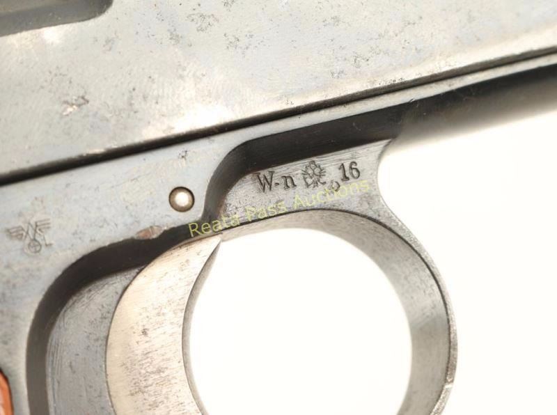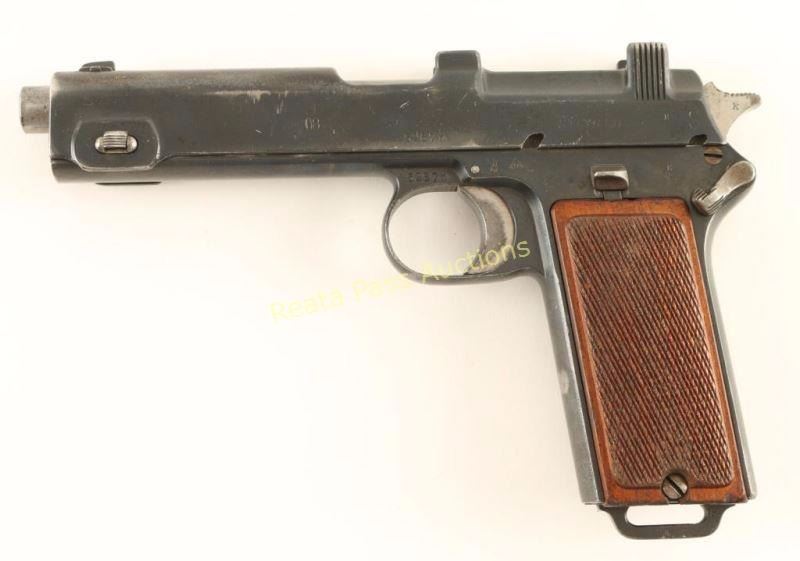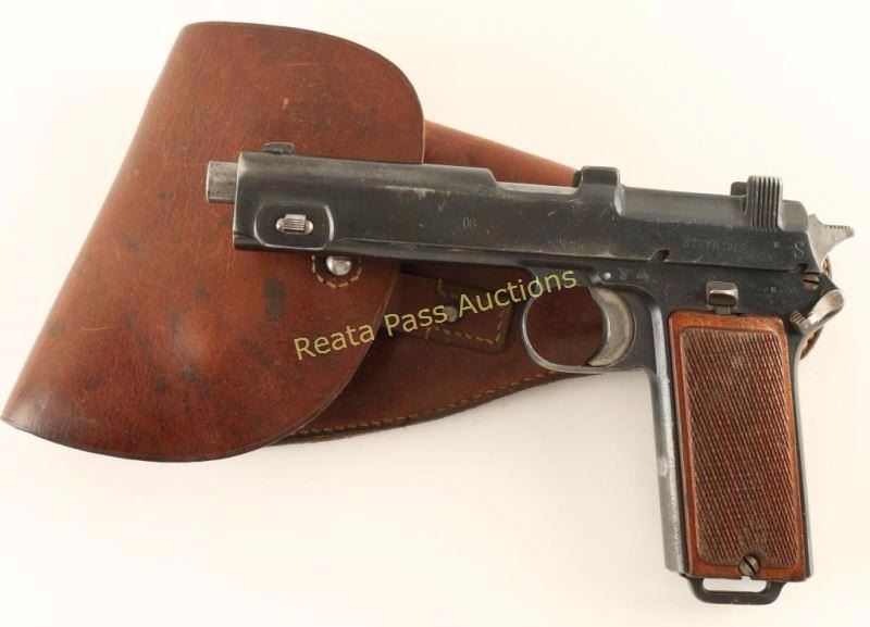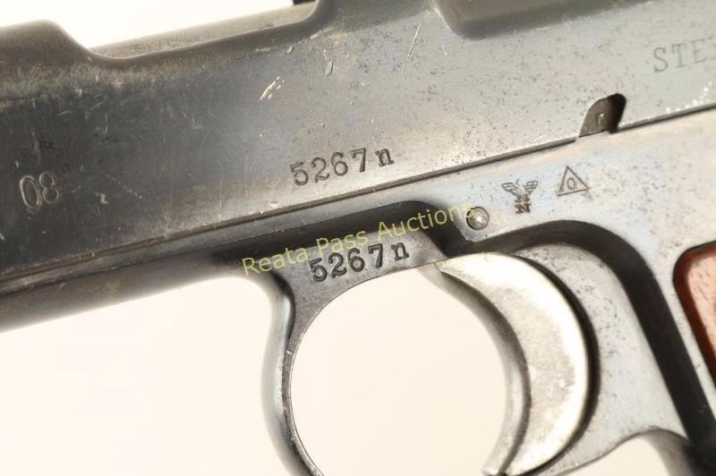 Nazi proofed single-action semi automatic pistol chambered in 9x19mm, originally produced for the Austrian military circa 1916. Features a blued refinish, 5.1" barrel, dovetailed patridge front sight, 'v' notched rear sight, stripper clip guide, smooth trigger, serrated hammer spur, thumb safety, integral 8 round magazine, lanyard loop and two-piece checkered walnut grips. Includes a stripper clip with old German ammo and a smooth brown leather belt loop flap holster with illegible stamp on the inside of the flap. No import marks and serial numbers match on the frame, slide and barrel. Markings: Slide - "08", "5267n", "STEYR 1916", "K" & "S". Frame - Eagle/swastika, "5267n", Eagle/N, 0 inside a triangle, "K", "W-n", undecipherable proof & "16". Barrel - Eagle/N & "5267". Pistol exhibits approximately 70% of it's blued refinish showing moderate holster wear and scattered light pin-prick pitting. Action is sound, bore is pristine and wood grips are very good. Condition is good+ as refinished. ***C&R Firearm*** ***Modern Firearm***
