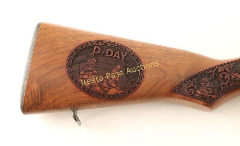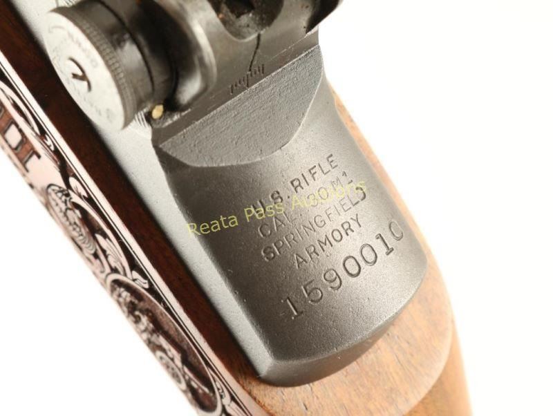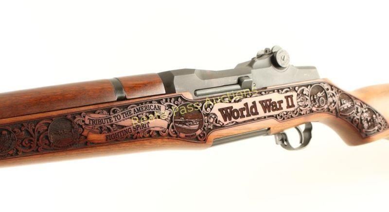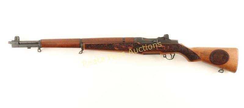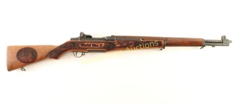 Customized U.S. Military clip-fed semi-automatic service rifle chambered in .30-06 Springfield, circa 1940. Features a matte blued refinish, 24" barrel marked "S-A -4-43", winged blade front sight, adjustable rear aperture sight with lock bar, bayonet lug, manual safety, SA marked bolt & trigger group, sling swivels, smooth trigger, checkered metal trapdoor buttplate, smooth walnut handguard and laser engraved "World War II" pistol grip shoulder stock with intricate battle scenes. Rifle retains approximately 97% of it's fine refinish showing few handling marks and light wear on the exposed portion of the barrel & gas tube. Action is smooth, bore is excellent and wood stocks are fine. Condition is excellent. ***C&R Firearm*** ***Modern Firearm***