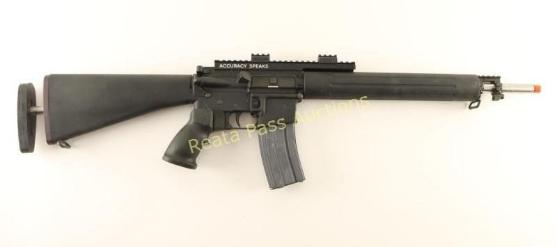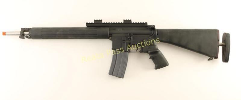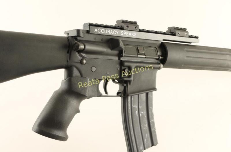 'Match HBAR' Gas-operated semi-automatic target-style AR platform rifle chambered in .223 Remington. Features a matte dark grey finish, heavy 18" stainless steel barrel with threaded muzzle, top rail gas block with bayonet lug, two-stage trigger, half-moon BCG, removed sear block, sling swivels, flat top receiver with with raised rails, forward assist, dust cover, shell deflector, 30 round magazine, manual safety, Magpul Bad Lever extended bolt catch, Rite-Pull grip extension with thumb rest pistol grip, fluted free-float aluminum handguard and A2 style shoulder stock with adjustable LOP. Rifle exhibits approximately 95% of it's original finish showing light even wear and some light scattered scratches/rubs. Action is crisp, bore is excellent, and stocks are very good. Condition is very good+++. ***Modern Firearm***