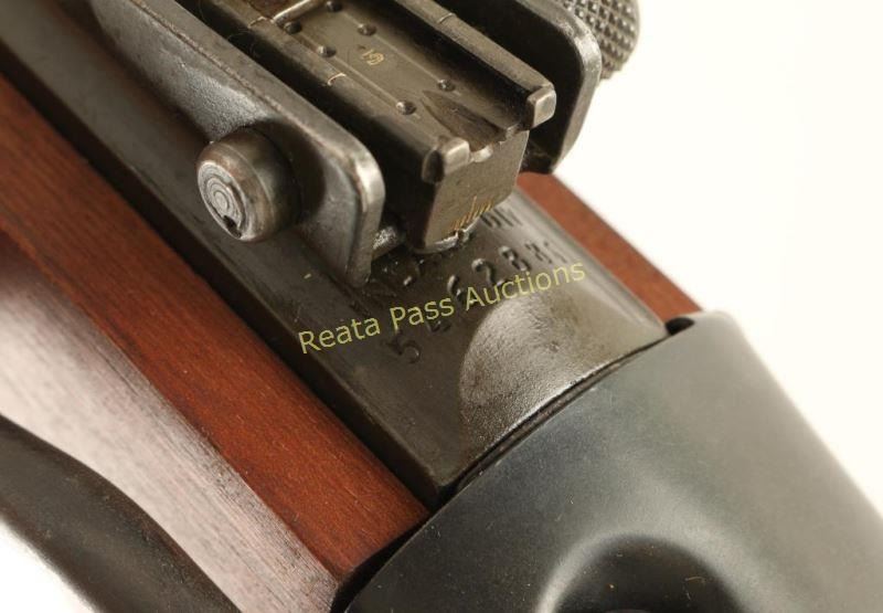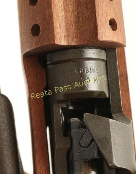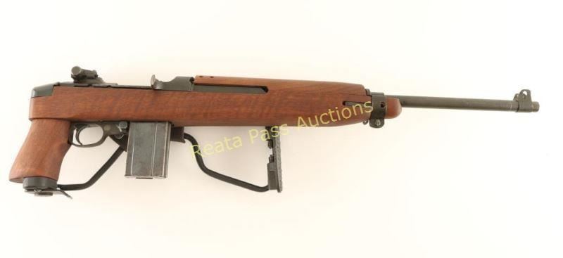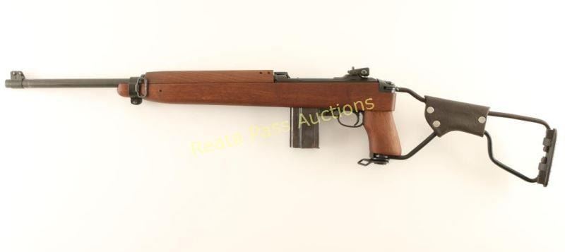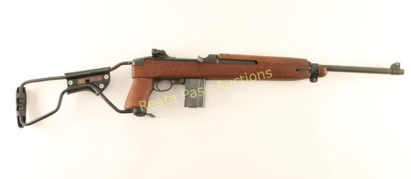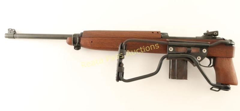 'Paratrooper' Rebuilt U.S. Military contracted semi-automatic service rifle chambered in .30 Carbine, circa 1943-1944. Features a parkerized finish, 18" Inland barrel dated 8-44, winged blade front sight, adjustable rear aperture sight, wide barrel band, push button safety, 15 round magazine, smooth trigger, round bolt, and reproduction stock set consisting of a four rivet handguard with wide groove, pistol grip stock with low-wood forend and wire side-folding shoulder stock. Rifle retains 92% of it's arsenal refinish showing some slide wear on the bolt & receiver and a few light handling marks on the barrel. Action is smooth, bore is excellent, and wood stock is fine. Condition is very good+++. ***C&R Firearm*** ***Modern Firearm***