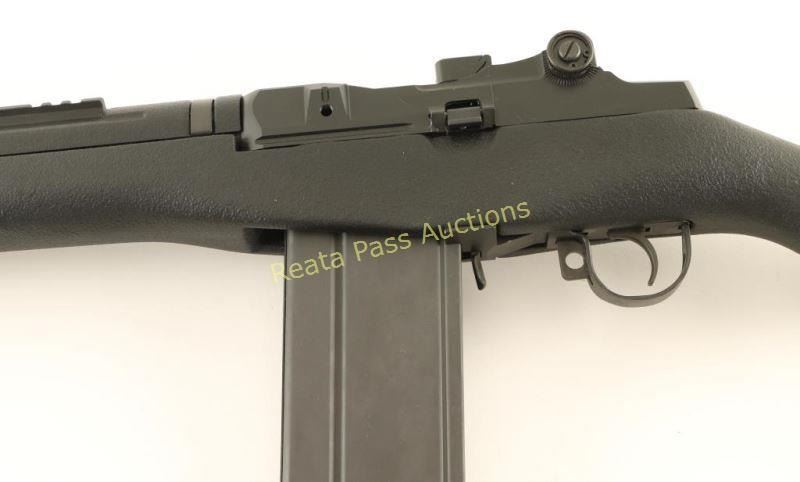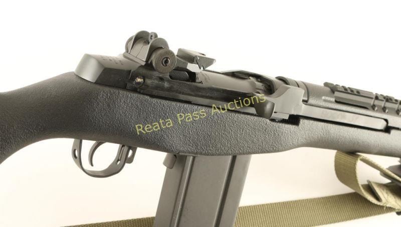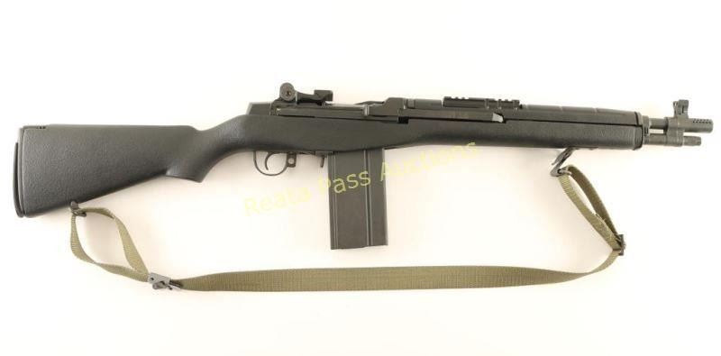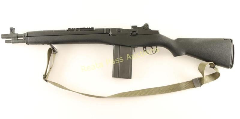 Compact semi automatic version of the M14 military battle rifle chambered in 7.62mm Nato. Features a matte blued finish, 16.25" barrel, muzzle break, Trijicon winged post front sight, adjustable rear aperture sight, integral scope rail, manual safety, C.M.I. 30 round magazine, stripper-clip guide, smooth two-stage trigger, green nylon sling, black synthetic handguard and fiberglass pistol grip shoulder stock with trapdoor buttplate. Rifle retains approximately 99% of it's original finish with very little handling marks or wear observed. Action is smooth, bore is pristine, and stock is fine. Condition is excellent. ***Modern Firearm***