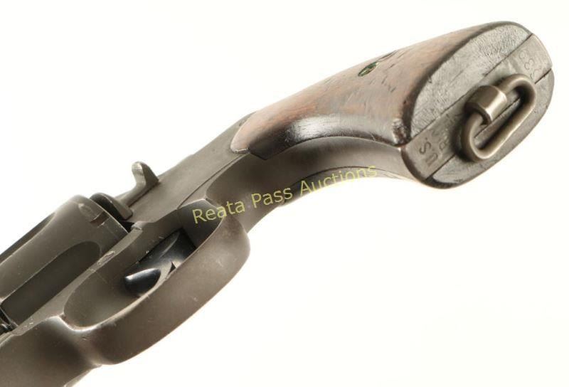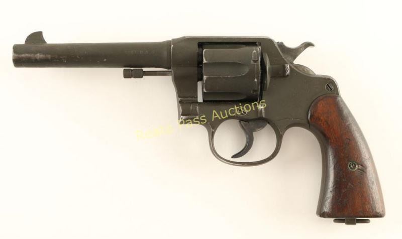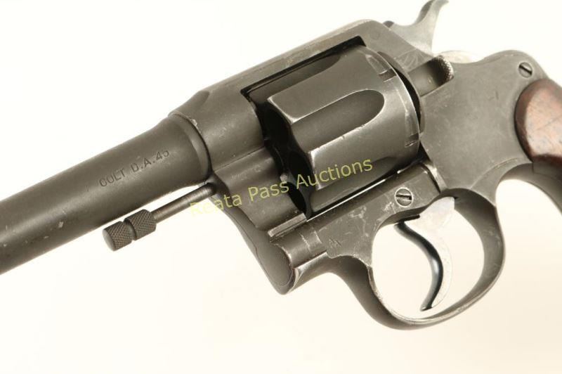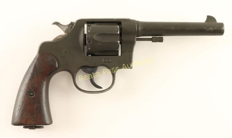 'Colt SN: 161910' Refinished U.S. Military double-action service revolver chambered in .45 Automatic, circa 1917. Features a parkerized refinish, 5.5" barrel, blade front sight, "u" notched rear sight, steel frame, fluted six-shot cylinder, non-shrouded ejector rod, smooth trigger, checkered hammer spur, lanyard ring, and two-piece smooth walnut grips. Markings: Frame - GHS monogram inside a circle, Rampant Colt, staggered AA, ARMY/MODEL/1917" & "No/9/639". Barrel - "UNITED STATES PROPERTY", "COLT'S PT FA. MFG. CO. HARTFORD CT U.S.A./PATD AUG 5.1884 JUNE 5 1900 JULY 4 1905" & "COLT D.A.45". Revolver exhibits approximately 80% of it's parkerized refinish showing moderate holster wear and handling marks. Action is sound with good lock-up, bore is bright with light rifling, markings are mostly good and wood grips are good with mild blemishes. Condition is good to very good as refinished. ***C&R Firearm*** ***Modern Firearm***