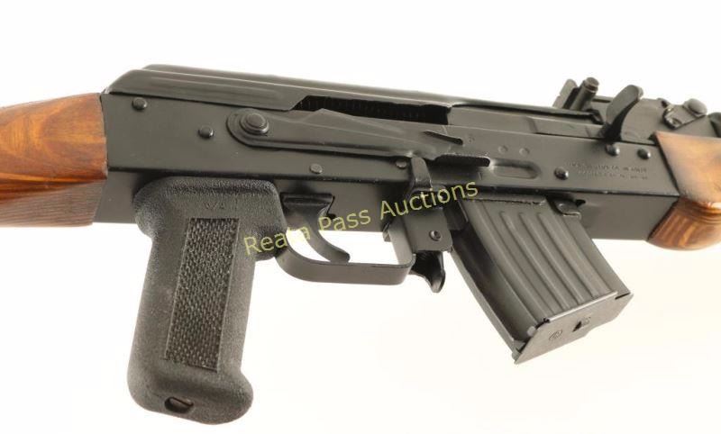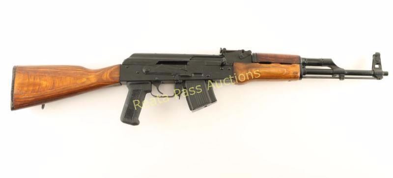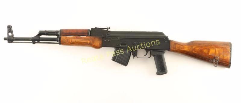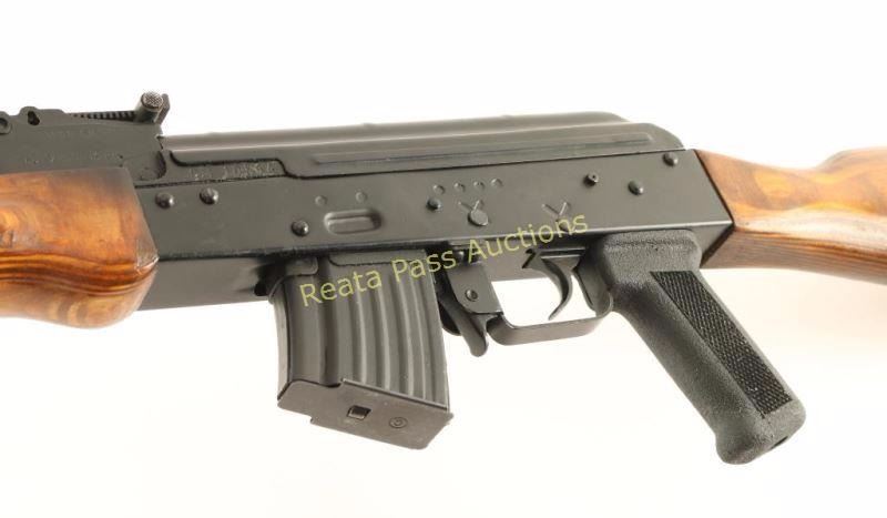 Egyptian made semi-automatic AK platform rifle chambered in 7.62x39mm. Imported by C.A.I. of St. Albans, V.T. with import marks on the receiver. Features a matte black finish, 16.25" non-threaded barrel, shrouded front sight, graduated rear sight to 1,000 meters, cleaning rod, 5 round steel magazine, manual safety, smooth trigger, shaved bayonet lug, smooth wood handguard, laminated wood forend, checkered black synthetic pistol grip and smooth laminated wood stock with serrated black plastic buttplate. Rifle retains approximately 95% of it's black finish showing few light handling marks on the barrel, light edge wear on the front sight and small blemishes on the right side of the receiver. Action is smooth, bore is pristine, are wood stocks are very good+ with a small loss to the bottom left side of the forend & rust on the sling swivel on the buttstock. Condition is very good+++. ***Modern Firearm***