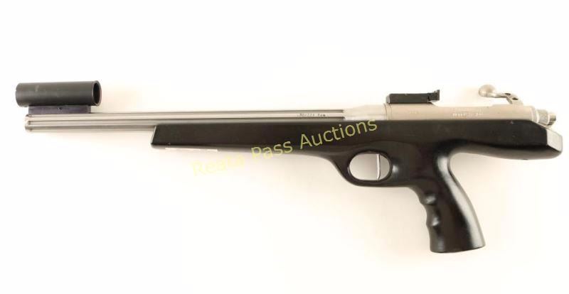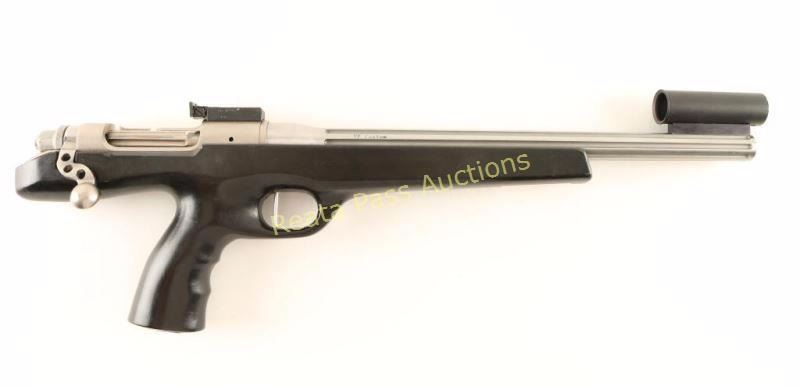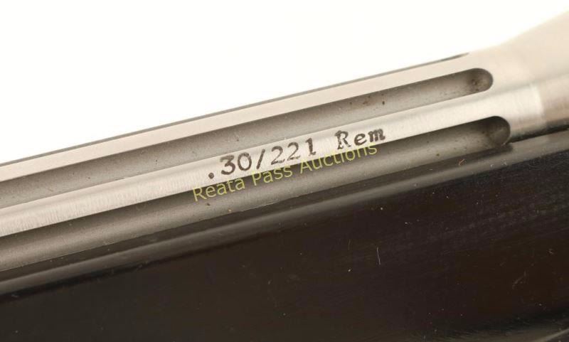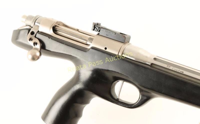 Customized single-shot bolt action pistol chambered in .30/221 Remington, circa 1963-1985. Features a satin silver finished receiver, fluted WF Custom 15" stainless steel barrel, globe front sight, Bo-Mar adjustable rear window sight, custom trigger, removed safety, fluted bolt, skeletonized bolt handle, and black wood stock with a 1996 NRA NATIONAL SILHOUETTE CHAMPIONSHIPS sticker. Pistol exhibits muzzle wear, minor handling marks, some light surface rust on the rear sight and a single small spot of dark rust on the receiver. Action is smooth, bore is pristine and wood stock is very good. Condition is very good++. ***Modern Firearm***