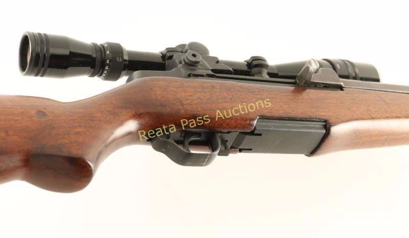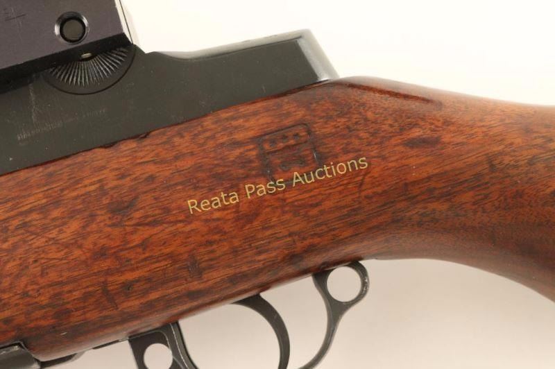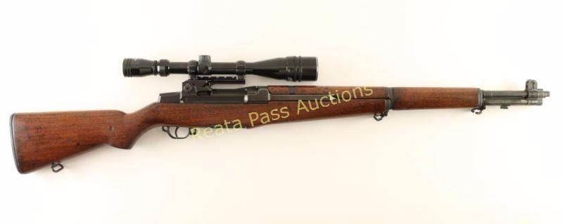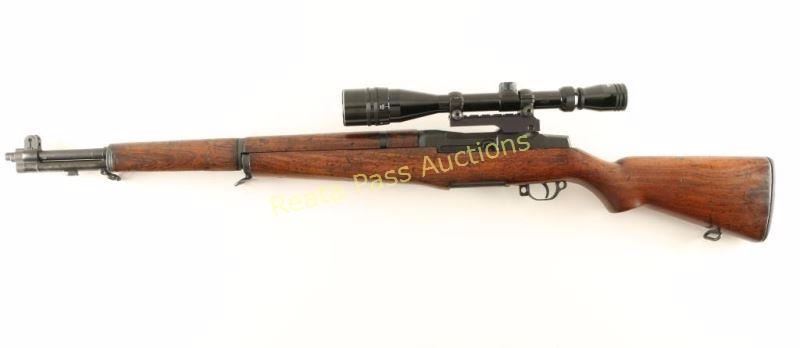 SN: 5640703 U.S. Military clip-fed semi automatic service rifle chambered in .30-06 Springfield, circa 1955. Features a parkerized finish, 24" HRA marked barrel dated 6-55, winged blade front sight, Tasco 6-24x 40mm scope on S&K base with adjustable aperture rear sight, bayonet lug, sling swivels, manual safety, HRA marked bolt, SA marked trigger group, checkered metal trapdoor buttplate, smooth walnut handguard and pistol grip shoulder stock with circled "P" & a Department of Defense acceptance cartouche. Rifle retains approximately 80% of it's arsenal refinish showing moderate wear on the exposed portion of the gas tube and light edge wear on the receiver & charging handle. Action is smooth, bore is excellent, optics are clear and wood stocks are good with several small blemishes. Condition is very good. ***C&R Firearm*** ***Modern Firearm***