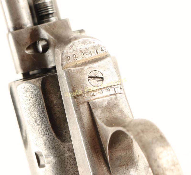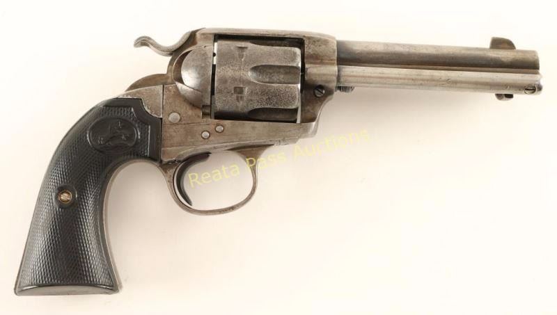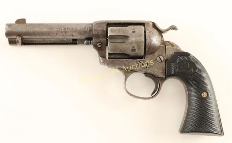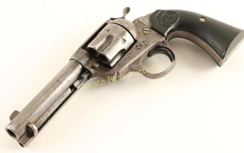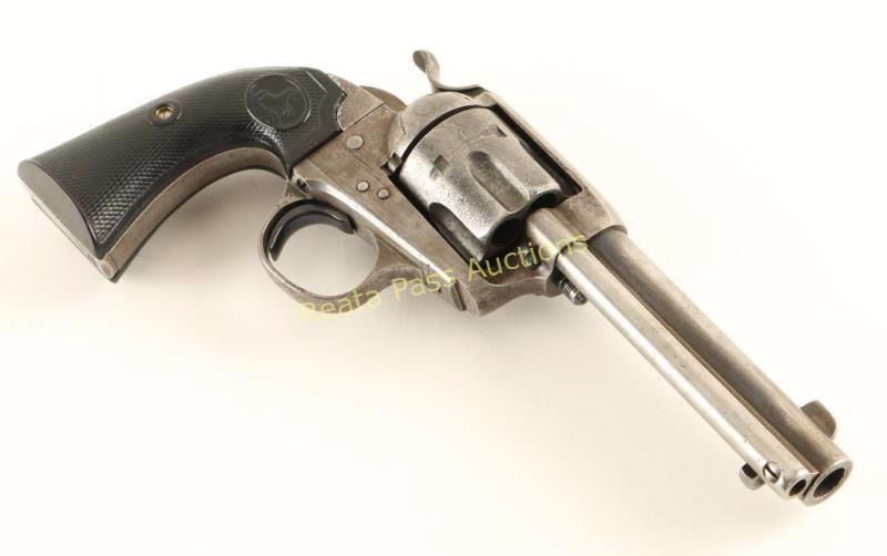 'First Generation' Single action six-shot revolver chambered in .45 Colt, circa 1902. Features a blued/case hardened finish, 4 3/4" barrel with two line address, ejector rod, blade front sight, 'v' notched rear sight, wide low-profile hammer spur, smooth replacement trigger, fluted cylinder, and reproduction Rampant Colt two-piece checkered black hard rubber grips. Markings are good and all serial numbers match with strike marks going across the numbers on the trigger guard and butt. Revolver exhibits little remaining original finish with light amounts found in protected areas and the balance of the metal surfaces in-the-white with a scattered light brown patina. The cylinder shows some pitting and the protected portion of the hammer on the left side shows vivid case colors. Action is crisp with four clicks, bore is very good with minimal rust/pitting and hard rubber grips are good as reproductions. Condition is good+. ***C&R Firearm*** ***Modern Firearm***
