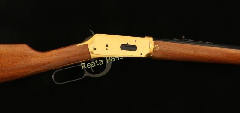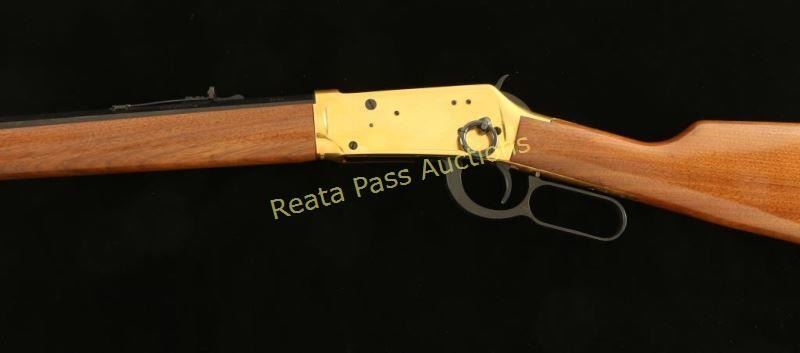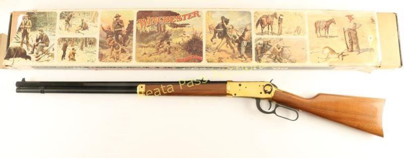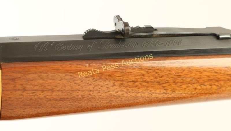 Commemorative lever-action repeating rifle chambered in .30-30 Winchester, circa 1966. One of only 102,309 produced, inscribed "A Century of Leadership 1866-1966" on barrel. Features a blued 26" octagonal barrel, full tube magazine, blade front sight, adjustable rear sporting sight, brass colored receiver drilled & tapped for a side mount sight, serrated hammer spur, beveled trigger, saddle ring, grip safety, metal forend cap, smooth wood forend and straight grip shoulder stock with metal buttplate. Includes the original factory box and dilapidated sleeve. Rifle exhibits light oxidation on the receiver and retains approximately 96% of it's blued finish on the barrel & magazine tube showing some small scattered dots of light surface rust. Action is smooth, bore is excellent and wood stocks are near fine with few minor blemishes. Condition is very good+++. ***C&R Firearm*** ***Modern Firearm***