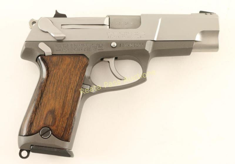 Full-size double action semi-automatic pistol chambered in .45 Automatic. Features a stainless steel slide, 4.5" barrel, pinned patridge front sight, drift-adjustable rear window sight, ambidextrous safety/decocker lever, push button magazine release, smooth trigger, serrated hammer spur, 7 round magazine, matte grey finished alloy frame, and two-piece smooth laminated wood grips. Includes a factory hard case. Pistol exhibits very little wear with a singe light rub on the frame as the only wear observed. Action is smooth, bore is excellent and grips are fine. Condition is near new in case. ***Modern Firearm***