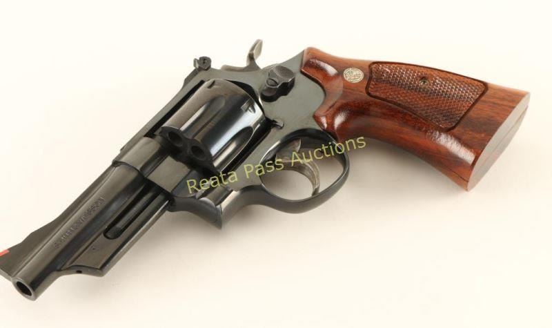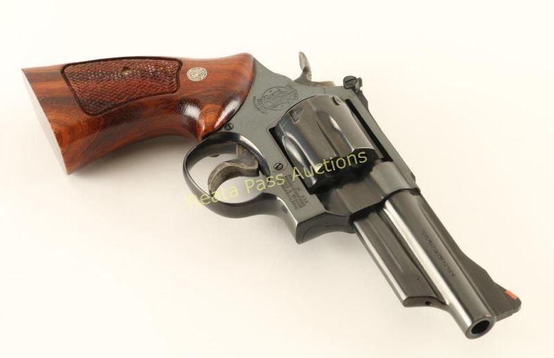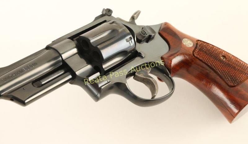 'Three Screw' Large frame double-action revolver chambered in .357 Magnum, circa 1982-1988. Features a blued finish, 4" ribbed barrel, shrouded ejector rod, raised ramp front sight with orange insert, adjustable micrometer click rear sight, fluted six-shot cylinder, .400" grooved trigger, .500" target hammer, finely checked top strap & barrel rib, ten-groove grip straps and checkered two-piece walnut target grips with Smith & Wesson medallions. Revolver exhibits approximately 98% of it's original finish showing very few light handling marks and a light drag line. Action is very smooth with very good lock-up, bore is pristine and wood grips are fine. Condition is excellent. ***Modern Firearm***