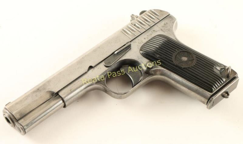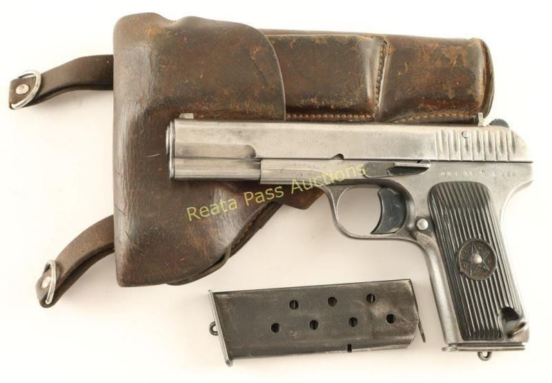 Soviet military semi-automatic pistol chambered in 7.62x25mm, circa 1939. Features a blued finish, 4.6" barrel, patridge front sight, dovetailed rear window sight, smooth trigger, serrated round hammer spur, push button magazine release, 8 round magazine with lanyard loop, steel frame with lanyard loop and two-piece grooved black hard rubber grips with CCCP Star logo. Includes a hanging smooth brown leather flap holster with spare magazine(C?941). No import marks. Markings: Slide - "?M314", five pointed star, & "1939". Frame - "?M314", five pointed star, "1936", & a "?" inside a circle. Barrel - "?M314" & five pionted star. Magazine - "?M660". Pistol has been extensively cleaned with little finish remaining and shows light scattered pin prick pitting. Action is smooth, bore is very good and grips are very good. Condition is good+. ***C&R Firearm*** ***Modern Firearm***