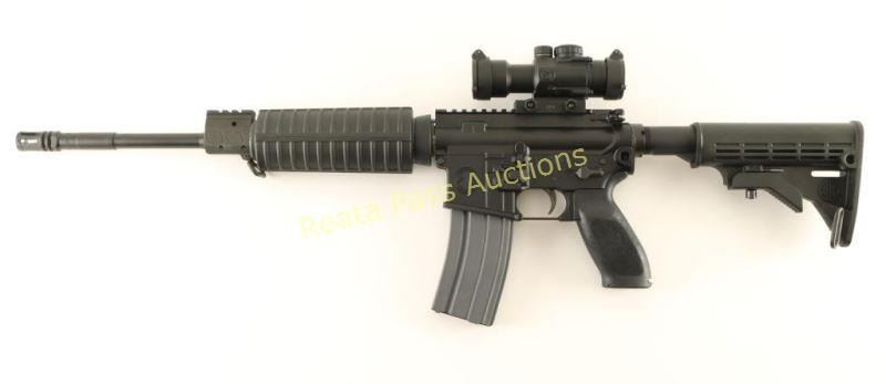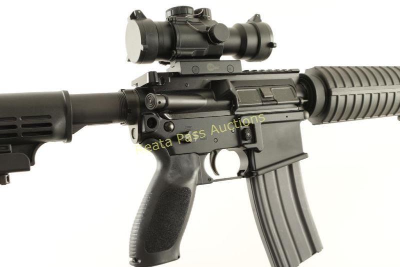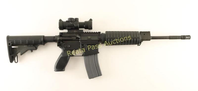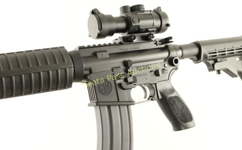 Quality AR platform semi-automatic rifle chambered in 5.56mm NATO. Features a matte black finish, 16" Nitride treated barrel with birdcage style flash hider, single rail gas block, flat top upper receiver, Sig CP4 4x prismatic scope with illuminated reticle & flip up covers, ambidextrous safety, dust cover, shell deflector, forward assist, forged 7075-T6 aircraft grade aluminum lower receiver with integral sling points, ambidextrous magazine release, 30 round steel magazine, sling swivels, carbine length black polymer handguard, Sig pistol grip with storage compartment and Sig 6 position collapsible shoulder stock. Rifle exhibits approximately 99% of it's original finish showing very light edge wear on the gas black and a single small handling mark observed on the upper receiver. Action is crisp, bore is pristine and stocks are fine. Condition is near new. ***Modern Firearm***