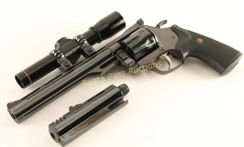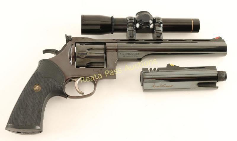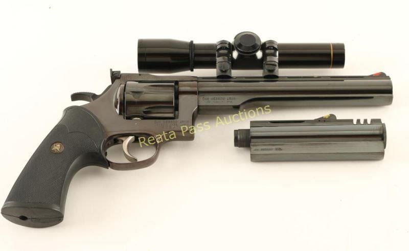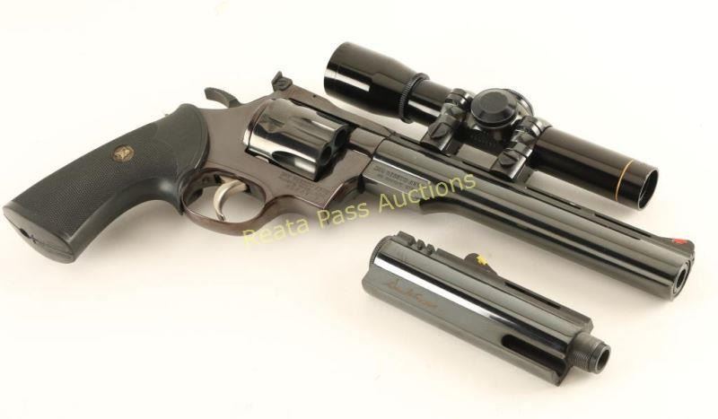 Large frame double action revolver chambered in .44 Magnum. Features a blued finish, 8" barrel with ventilation rib shroud, ramp front sight with red insert. adjustable rear window sight, Leupold M8-2x E.E.R. Scope, fluted six-shot cylinder, shrouded ejector rod, smooth trigger, checkered hammer spur, transfer bar safety, and one-piece checkered black rubber Pachmayr Presentation wrap-around grips. Includes 44 rounds of Winchester 240 gain JSP ammo, a large camo holster, a padded soft case and a Dan Wesson 4" barrel with a 4.85" ported barrel shroud w/ ventilation rib. Revolver exhibits approximately 97% of it's original finish showing only slight muzzle wear, few light handling marks, a drag line on the cylinder and the frame has turned plum. Action is smooth with very good lock-up, bore is excellent, optics are clear and rubber grips are near fine. Condition is excellent. ***Modern Firearm***