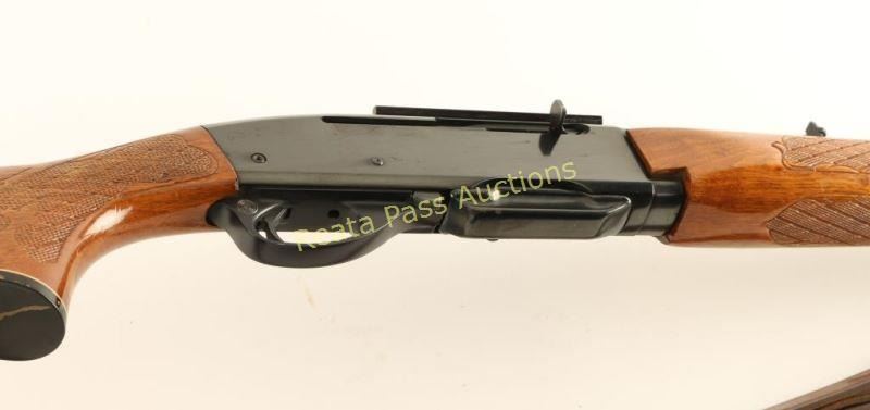 'Woodsmaster' Magazine-fed semi-automatic sporting rifle chambered in .30-06 Springfield. Features a blued finish, 22" barrel, ramped blade front sight, adjustable rear sporting sight, installed scope base, 4 round detachable magazine, push button safety, beveled trigger, Hunter smooth brown leather sling, fancy checkered walnut forend and pistol grip shoulder stock with black grip cap & factory checkered black plastic buttplate. Rifle retains approximately 90% of it's original blued finish showing some light scratches/handling marks along with a few small scattered losses. Action is crisp, bore is very good and wood stocks are very good with several light scrapes & dings. Condition is very good. ***Modern Firearm***