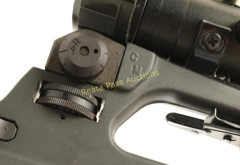 'LMG' Scare air-cooled light machine gun upper that is no longer in production. Features a matte grey finish, heavy 20" barrel with birdcage style flash hider, A2 style front sight, integral carrying handle on the receiver with adjustable dual aperture rear sight, Norinco scope mounted on a see-through base, adjustable folding bipod, nickel boron coated FA BCG, shell deflector, dust cover, standard charging handle and extra large black synthetic handguard with an additional carrying handle. Upper shows some mild handling marks and few light scratches. Bore is excellent, optics are clear and synthetic furniture is very good. Condition is very good+++.