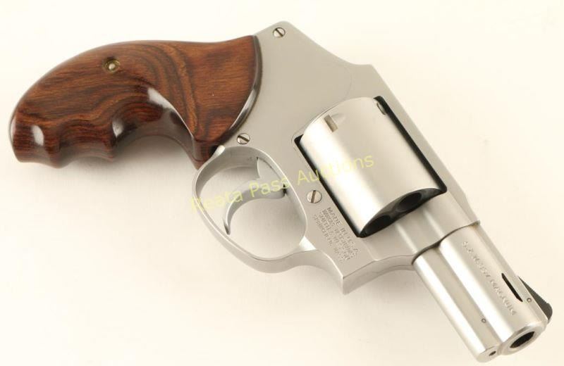 'Performance Center RSR Special' Small frame stainless steel double-action-only revolver chambered in .357 Magnum, circa 1996. Features a glass bead finish, 2 1/8" magna ported barrel with solid top rib & full underlug, pinned ramp front sight, square notched rear sight, non-fluted five-shot cylinder, concealed hammer, .312" smooth combat trigger, and two-piece laminated wood smooth finger groove grips. Includes a smooth brown leather Bianchi Chief Special paddle holster. Revolver exhibits some bright scuffs to it's satin finish with no other wear observed. Action is crisp, bore is excellent and wood grips are fine. Condition is near excellent. ***Modern Firearm***