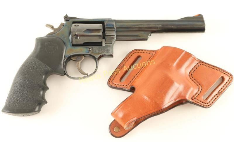 'Combat Magnum' Refinished double-action revolver chambered in .357 Magnum, circa 1967-1977. This revolver was used by a security guard at the University of Cal Poly Pomona and was gifted to him when he retired. Features a bright blued refinish, 6" barrel with solid rib, shrouded ejector rod, ramped front sight with orange insert, micrometer click rear sight with white outline, fluted six-shot cylinder, case hardened & serrated .400" target trigger, .375" case hardened semi-target hammer, "UCPP 48" stamp on the frame and one-piece pebbled black rubber Hogue Monogrip. Includes a smooth brown leather Bianchi #5 Black Widow holster. Revolver exhibits approximately 96% of it's blued refinish showing some light scattered scratches and a drag line. Action is smooth with good lock-up, bore is excellent and grips are very good. Condition is very good as refinished. ***Modern Firearm***