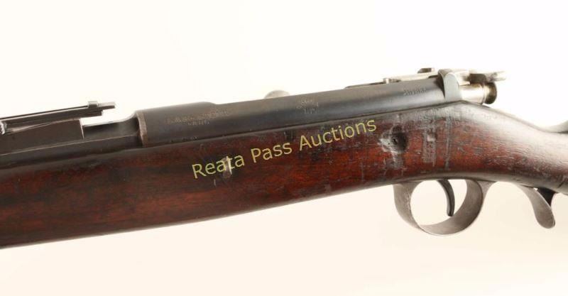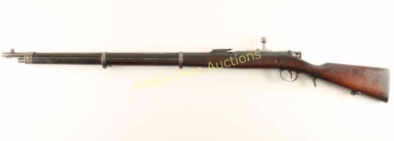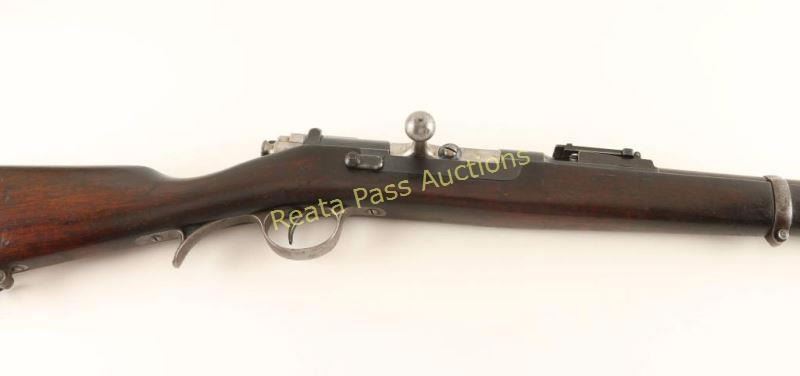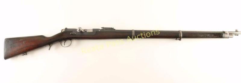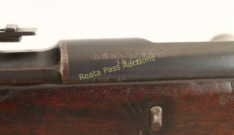 Austrian made bolt-action service rifle chambered in 8x60Rmm, built for Portugal circa 1886 and modeled after the Mauser 71-84. It features a blued finish, 32.25" barrel, dovetailed inverted 'v' front sight, flip-up ladder rear sight, full length tube magazine, bayonet lug, cleaning rod, polished bolt with straight handle, magazine cut off switch, manual safety, sling swivels and smooth full length wood stock with metal buttplate & two illegible circular cartouches on the buttstock. Serial numbers match on the receiver & barrel with different matching numbers on the bolt handle and safety. Rifle exhibits a molten brown patina on the barrel mixed with bare metal and retains approximately 90% of it's thinning blued finish on the receiver showing light edge wear. Action is smooth, bore is excellent and wood stocks are very good with numerous small blemishes. Condition is fine. ***Antique Firearm***