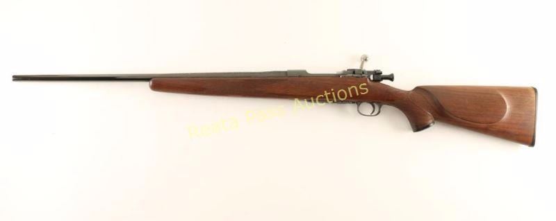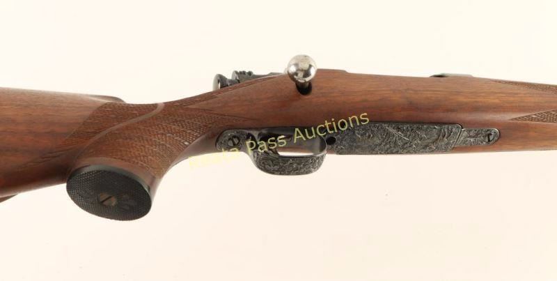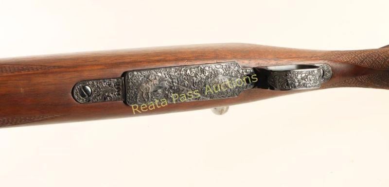 Finely sporterized U.S. military bolt-action service rifle chambered in .30-06, circa 1942. Features a blued finish, floral scroll engraving with embossed game scenes on the floorplate, 24" barrel with no provisions for sights, jeweled bolt, smooth trigger, integral box magazine, magazine cut-off, manual safety, and fancy skip line checkered walnut pistol grip shoulder stock with black grip cap & checkered buttplate. Rifle retains approximately 99% of it's finely blued refinish showing little to no visible wear. Action is smooth, bore is good with what like some light scattered pitting and wood stock is fine. Condition is near excellent as sporterized. ***C&R Firearm*** ***Modern Firearm***