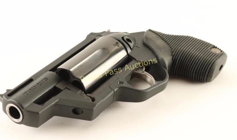 SN: GW838012 'Public Defender Poly' Brazilian made polymer frame double-action revolver chambered for .45 Colt or .3" 410 gauge shells. Features a blued finish, 2" barrel, ramped fiber optic front sight, drift adjustable rear window sight, shrouded ejector rod, fluted five-shot cylinder, serrated case hardened trigger, case hardened hammer with checkered spur & integral locking safety, black polymer frame and one-piece black rubber grip with Taurus medallions. Includes a factory hard case. Revolver exhibits approximately 98% of it's blued finish showing only a faint drag line on the cylinder. Action is smooth with very good lock-up, bore is excellent and rubber grip is fine. Condition is near new in box. ***Modern Firearm***