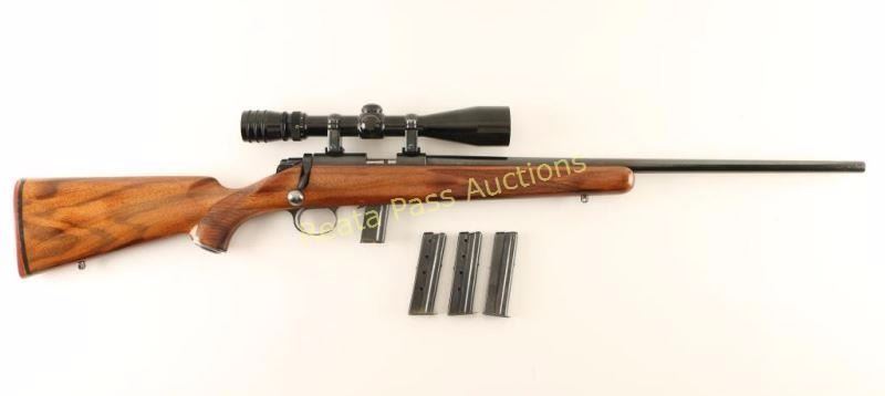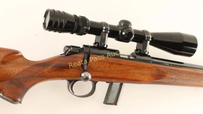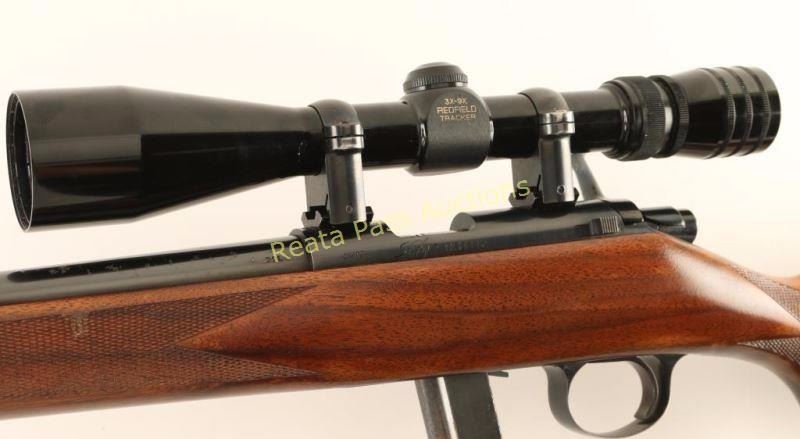 High quality magazine fed bolt action sporting rifle chambered in .22 Long Rifle. Features a blued finish, 22.25" tapered barrel with no provisions for sights, Redfield 3-9x scope, straight bolt handle with round knob, rotating manual safety, smooth wide trigger, 10 round magazine, swivel studs, and one-piece checkered walnut pistol grip shoulder stock with metal grip cap & factory recoil pad. Includes three additional 10 round magazines. Rifle exhibits approximately 85% of it's original blued finish showing heavy muzzle wear and several small areas of finish loss on the barrel which appears to be from removing rust. Action is smooth, bore is pristine and refinished wood stock is very good with semi-worn checkering. Condition is very good. ***Modern Firearm***