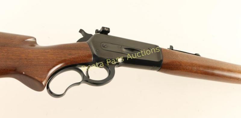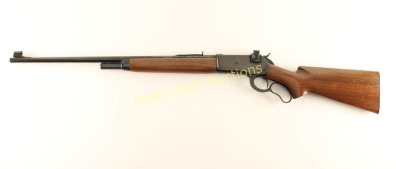Quality Japanese made lever action repeating rifle chambered in .348 Winchester, circa 1987. This was part of a limited edition run with only 3,000 produced with this barrel length. Features a blued finish, 24" barrel, ramped & hooded blade front sight with brass bead, semi-buckhorn rear sight(missing ramp), Williams adjustable receiver sight, 4-round tubular magazine, smooth trigger, serrated hammer spur, smooth semi-beavertail walnut forend and pistol grip shoulder stock with checkered metal buttplate. Rifle exhibits approximately 98% of it's original blued finish showing light wear on the loading gate and a small dot of finish loss on the lower tang from the lever rubbing against it. Action is smooth, bore is excellent and wood stocks are near fine with a few small blemishes. Condition is excellent. ***Modern Firearm***
