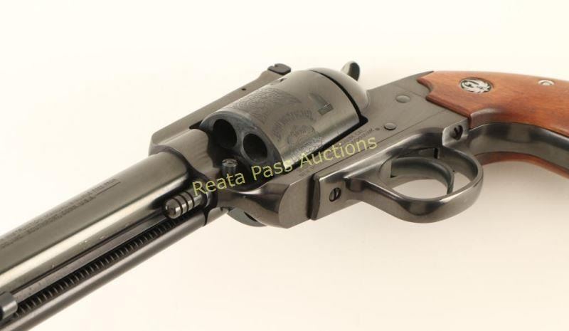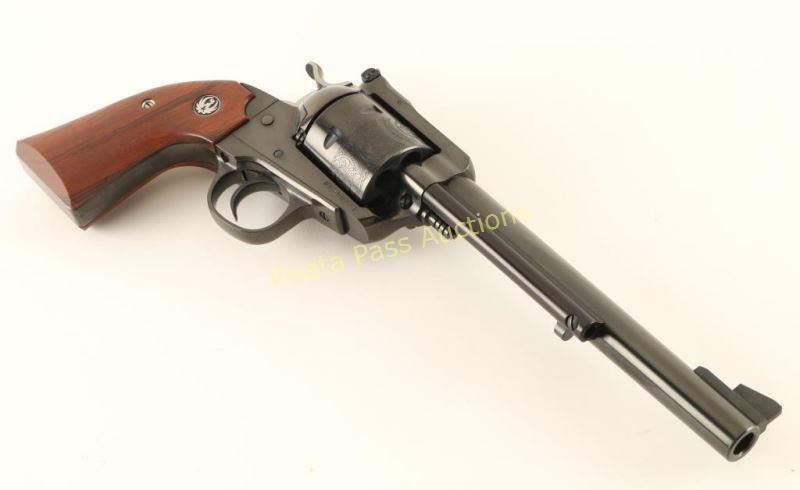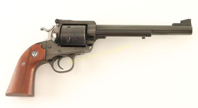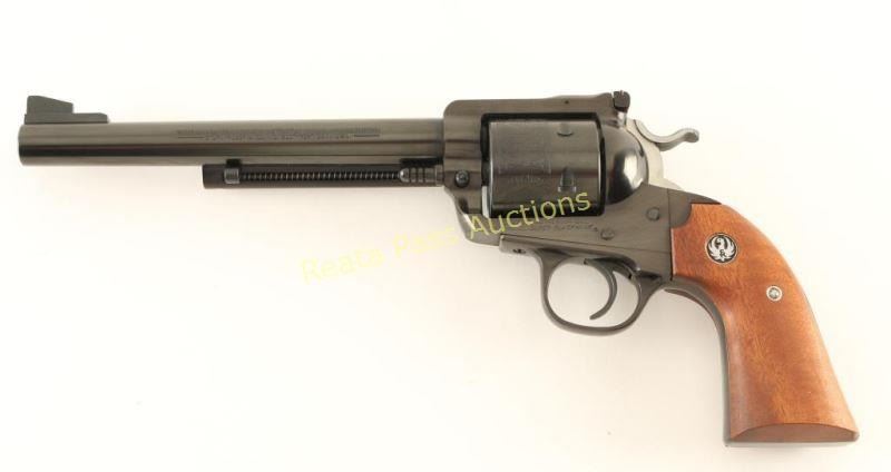 SN: 85-50221 'Bisley Model' Large frame single-action revolver chambered in .44 Magnum, circa 1986. Featured a blued finish, 7.5" barrel, raised blade front sight, adjustable rear window sight, ejector rod, non-fluted six shot cylinder with roll stamped Bisley design, transfer bar safety, serrated wide low-profile hammer spur, smooth trigger, humpback backstrap, and two-piece smooth wood grips with Ruger medallions. Revolver exhibits approximately 97% of it's original finish showing a light drag line on the cylinder and a few small scattered losses. Action is smooth with very good lock-up, bore is excellent and wood grips are fine. Condition is excellent. ***Modern Firearm***
