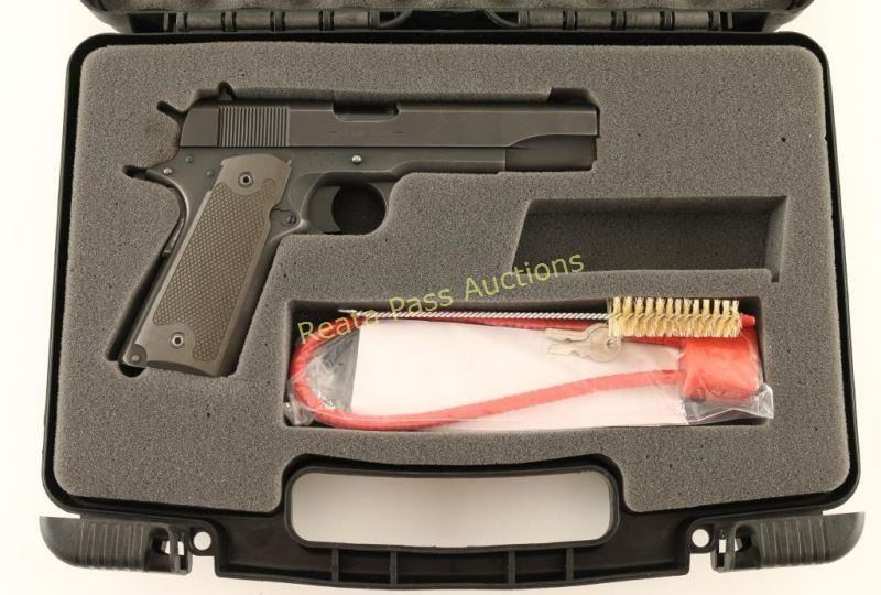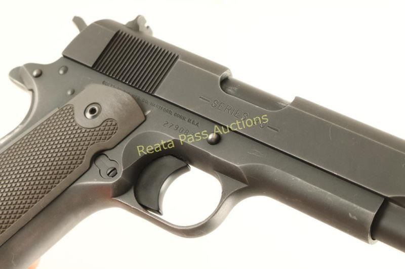 'Series 80' Classic 1911-A1 style semi-automatic pistol chambered in .45 Automatic, circa 1990's. Features a matte blued finish, 5" barrel, patridge front sight, dovetailed rear window sight, old roll stamp side marking, 1911 style long nylon trigger, thumb safety, beavertail grip safety, 1911 style serrated nylon mainspring housing, 8 round factory magazine, serrated hammer spur and two-piece checkered metal grips. Includes a hard case with fitted foam inserts, brush & lock. Pistol exhibits approximately 85% of it's original finish showing light edge wear, slide wear on the barrel, handling marks and a small amount of surface rust forming on the slide above the "COLT" marking. Action is smooth bore appears excellent but dirty and metal grips are fine. Condition is very good in box. ***Modern Firearm***