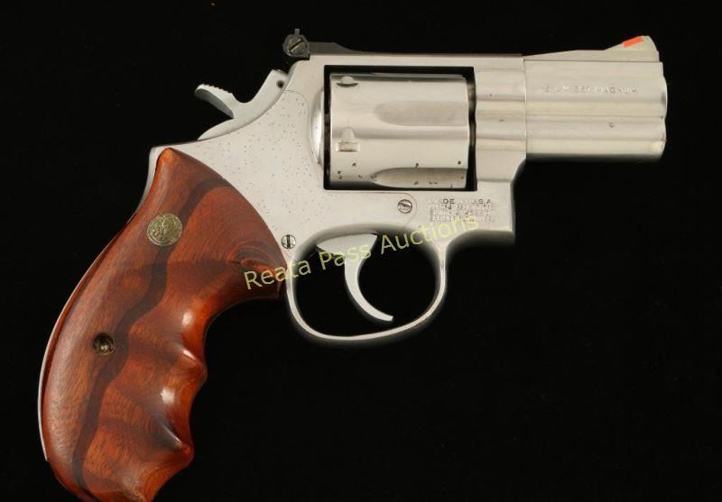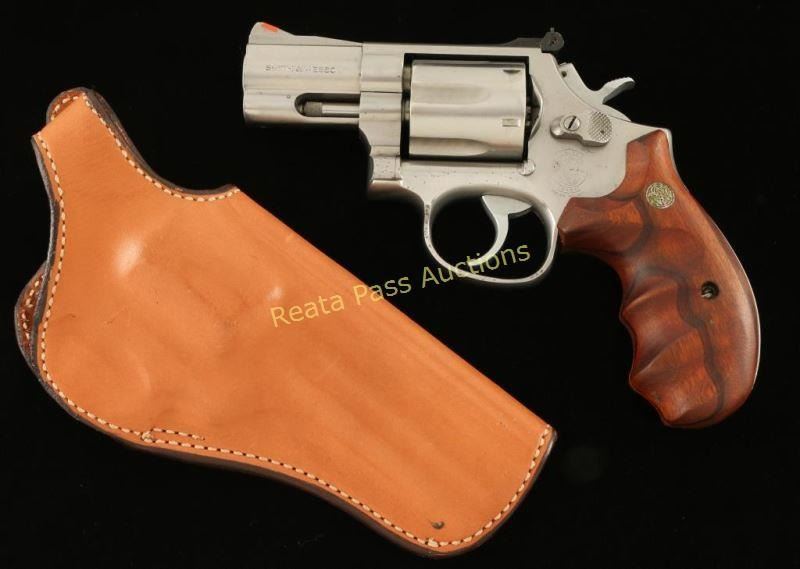 Quality medium frame stainless steel double action revolver chambered in .357 magnum, circa 1986-1987. Features a brushed finish, 2.5" ribbed barrel with full underlug, raised ramp front front sight with orange insert, micrometer click rear sight, fluted six-shot cylinder, .312" smooth combat trigger, .375" semi-target hammer, serrated grip frame and two-piece smooth wood finger groove grips with S&W medallions. Includes a Bianchi smooth brown leather belt loop holster. Revolver exhibits light holster wear and some scattered pin prick pitting observed on the side plate and one the cylinder around one of the flutes. Action is smooth with solid lock-up and wood grips are very good with worn finish. Condition is very good. ***Modern Firearm***
