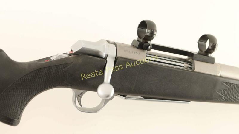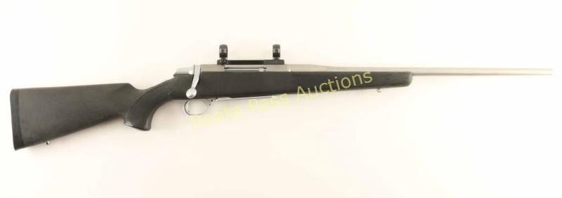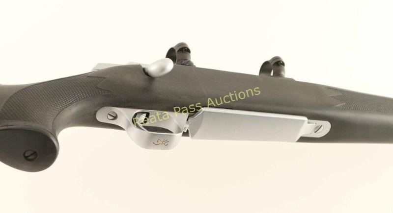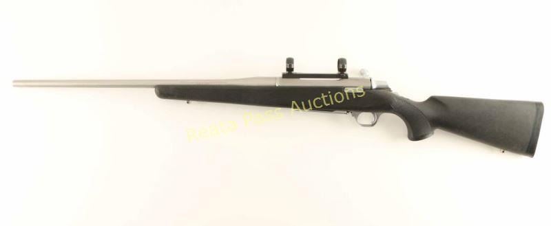 'Stalker' Japanese made stainless steel bolt action sporting rifle chambered in .30-06 Springfield, circa 1993. Features a satin finish, floated 22" barrel with no provisions for sights, Leupold scope base & rings, sliding tang safety, cocked indicator, hinged floorplate with removable magazine, fluted bolt, wide trigger, swivel studs and checkered black synthetic pistol grip shoulder stock with factory recoil pad. Rifle exhibits light handling wear & scratches and shows some scattered surface rust emerging on the receiver. Action is smooth, bore is pristine and synthetic stock is fine. Condition is very good++. ***Modern Firearm***