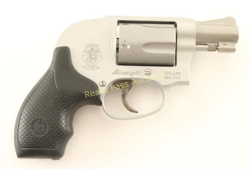 'Bodyguard Airweight' Lightweight small frame double-action revolver chambered for .38 Special(+P rated), circa 2004-2006. Features a satin silver finish, 1 7/8" stainless steel barrel, forged ramp front sight, square notched rear sight, non-shrouded ejector rod, fluted five-shot stainless steel cylinder, alloy frame, .312" smooth trigger, .240" shrouded hammer, transfer bar safety, internal locking safety, and S&W one-piece texture black rubber wrap-around grips. Includes the original factory hard case with documents, lock, wax paper, spent case & keys. Revolver exhibits only a drag line on the cylinder and light rubs from carrying with no major wear observed. Action is smooth with good lock-up, bore is pristine and rubber grips are fine. Condition is near excellent in case. ***Modern Firearm***