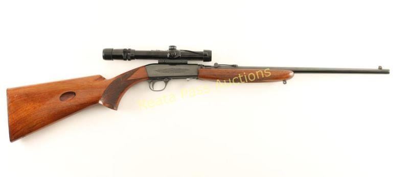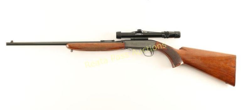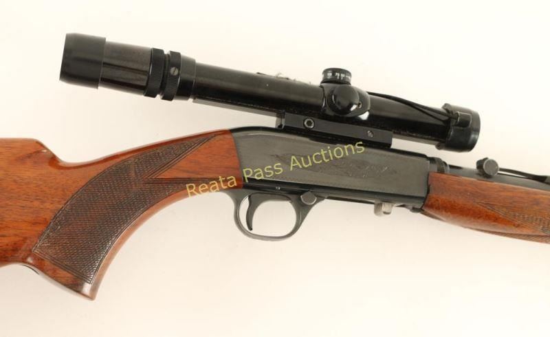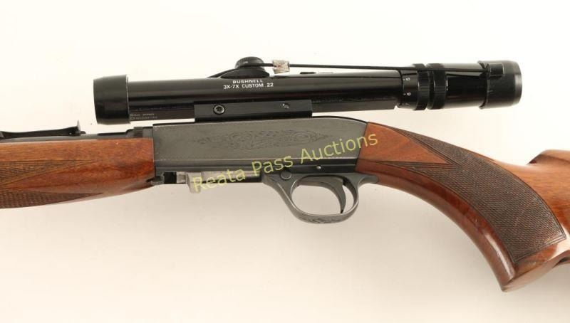 Early Belgium made tube-fed semi-automatic rifle chambered in .22 Long Rifle, circa 1956-1974. Features a blued finish, 19.25" take-down barrel, dovetailed blade front sight with brass bead, wheel adjustment rear sight, Bushnell Custom .22 3-7x scope, lightly floral scroll engraved receiver, 11 round tubular magazine, push button safety, smooth trigger, swivel stud, checkered walnut forend & pistol grip shoulder stock with serrated metal buttplate & a flush mounted quick detach sling point installed. The underside of the bolt has "Mottl 74" scratched into it for the year and the man's last name who owned the rifle, his social security number is also inscribed. Rifle retains approximately 94% of it's blued finish showing light wear, a small loss on the barrel and some light freckles of surface rust observed on the barrel. Action is smooth, bore is excellent, markings are crisp, and wood stock is good with moderate dings & a crack on the right side of the wrist. Condition is very good+. ***Modern Firearm***