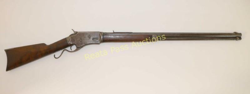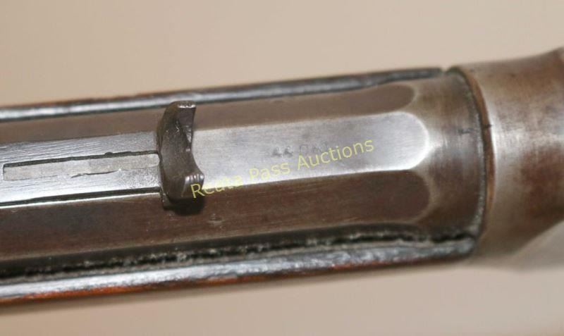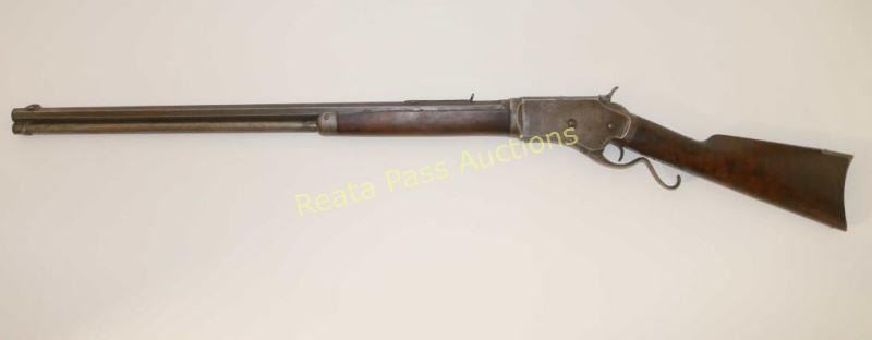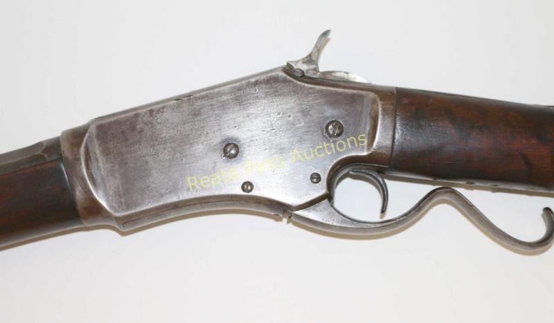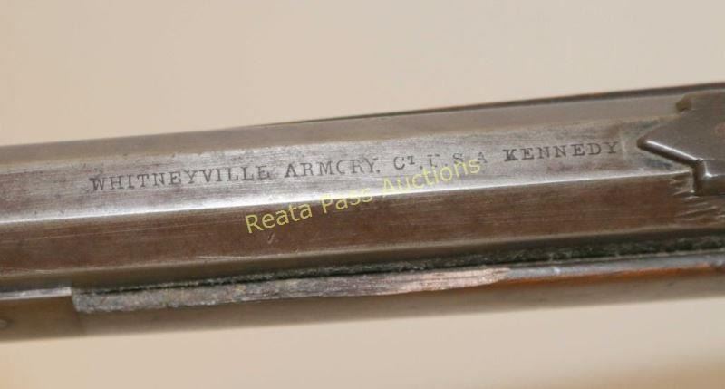 Early lever action repeating rifle chambered in .44-40 Winchester, circa 1880's. Features a blued finish, 28" octagonal barrel marked "WHITNEYVILLE ARMORY, CT. U.S.A KENNEDY", full length tube magazine, German silver blade front sight, buckhorn rear sight(missing ramp), 's' shaped lever, checkered thumbprint hammer spur, metal forend cap, smooth walnut forend and straight grip shoulder stock with crescent trapdoor buttplate. The tang is marked "PAT’D JANY. 7-73. APRIL 12 ) MAY 13 & AUG. 12-79." The rifle's finish has moves to an even dark brown patina with evidence of bright bluing in protected areas. Action performs well, bore is good with some moderate pitting towards the muzzle and wood stocks are very good with a 2 3/4" chip along the top[ left side of the forearm & a crack at the toe of the shoulder stock with a nail placed to keep it from progressing. Condition is good to very good. ***Antique Firearm***