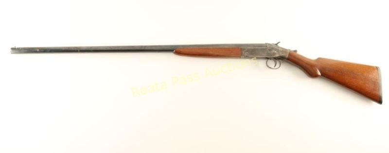 Blued and case-colored single shot top-break, exposed hammer shotgun with a 32" barrel, single bead front sight, exposed hammer, round knob pistol grip stock and a black plastic butt plate. Barrel has a little surface rust and many paint splatters on it. Bore is nasty with either dirt, rust or pitting. Receiver and stock iron have some surface rust on them. Case coloring is faded. Trigger guard is in-the-white and has rust. Action works well. Butt stock has dings, rubs and scrapes. Butt plate has dings, rubs and scrapes. Condition is poor to fair.