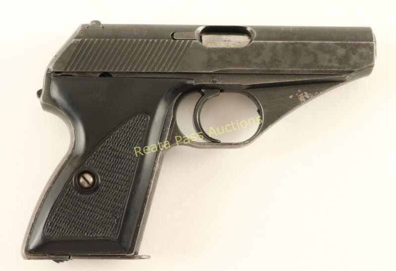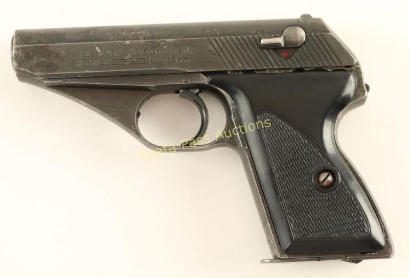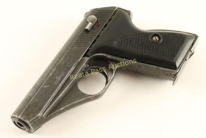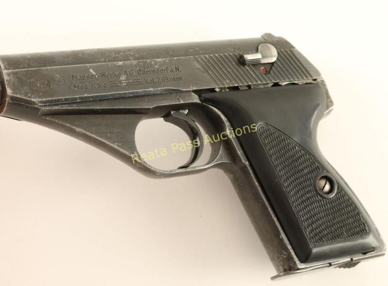 'Late Nazi Army Model' German made compact double-action semi automatic pistol chambered in 7.65mm, circa 1939-1945. Features a blued finish, 3.3" barrel, patridge front sight, dovetailed rear window sight, steel frame, smooth trigger, small serrated round hammer spur, 8 round magazine, thumb safety and two-piece aftermarket checkered black plastic grips. No import marks. Markings: Slide - Mauser banner & "Mauser-Werke A.G. Oberndorf a.N./Mod HSc Kal. 7,65mm". Frame - Eagle/135, Eagle/N & "811730". Barrel - Eagle/N & "730". Pistol exhibits approximately 70% of it's original finish showing "blooding" or light scattered pin-prick pitting. Action is sound, bore is pristine and plastic grips are very good. Condition is good to very good. ***C&R Firearm*** ***Modern Firearm***